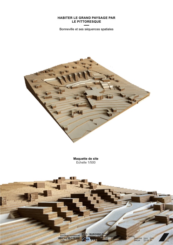 ![]() Florian BurosseHabiter le grand paysage par le pittoresqueBonneville et ses séquences spatialesLe projet se situe aux coteaux Nord de Bonneville. Zone pavillonnaire caractérisée par des comportements individualistes, les coteaux Nord sont marqués par l’absence d’espaces communs favorisant l’échange et le dialogue, et par la présence du lycée hôtelier François Bise. Plaçant ainsi les habitants et les lycéens au sein du processus architectural, le projet a pour ambition de restaurer des espaces communs et privés, permettant une appropriation de la part de chacun. Trois entités architecturales à la fois disparates et communicantes sont mises en œuvre : les habitats intermédiaires, permettant de conserver les modes de vie actuels tout en proposant une requalification des espaces communs et de la notion de parcelle, le restaurant universitaire, dédié exclusivement aux lycéens et favorisant une continuité avec le lycée hôtelier, ainsi que des espaces communs comme vecteurs d’échanges. Les dispositifs architecturaux et urbains questionnent le rapport à leur environnement proche et lointain, floutant les limites entre intérieur et extérieur, bâti et non bâti.
