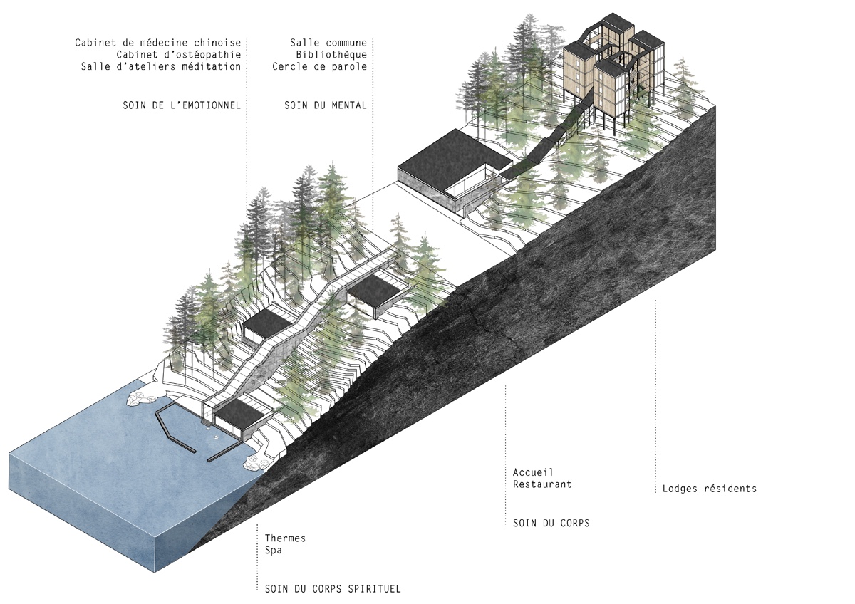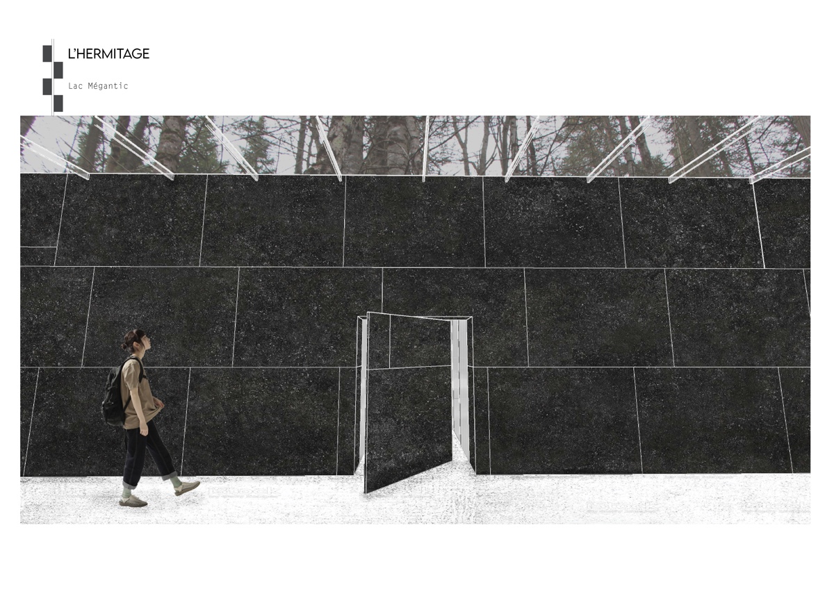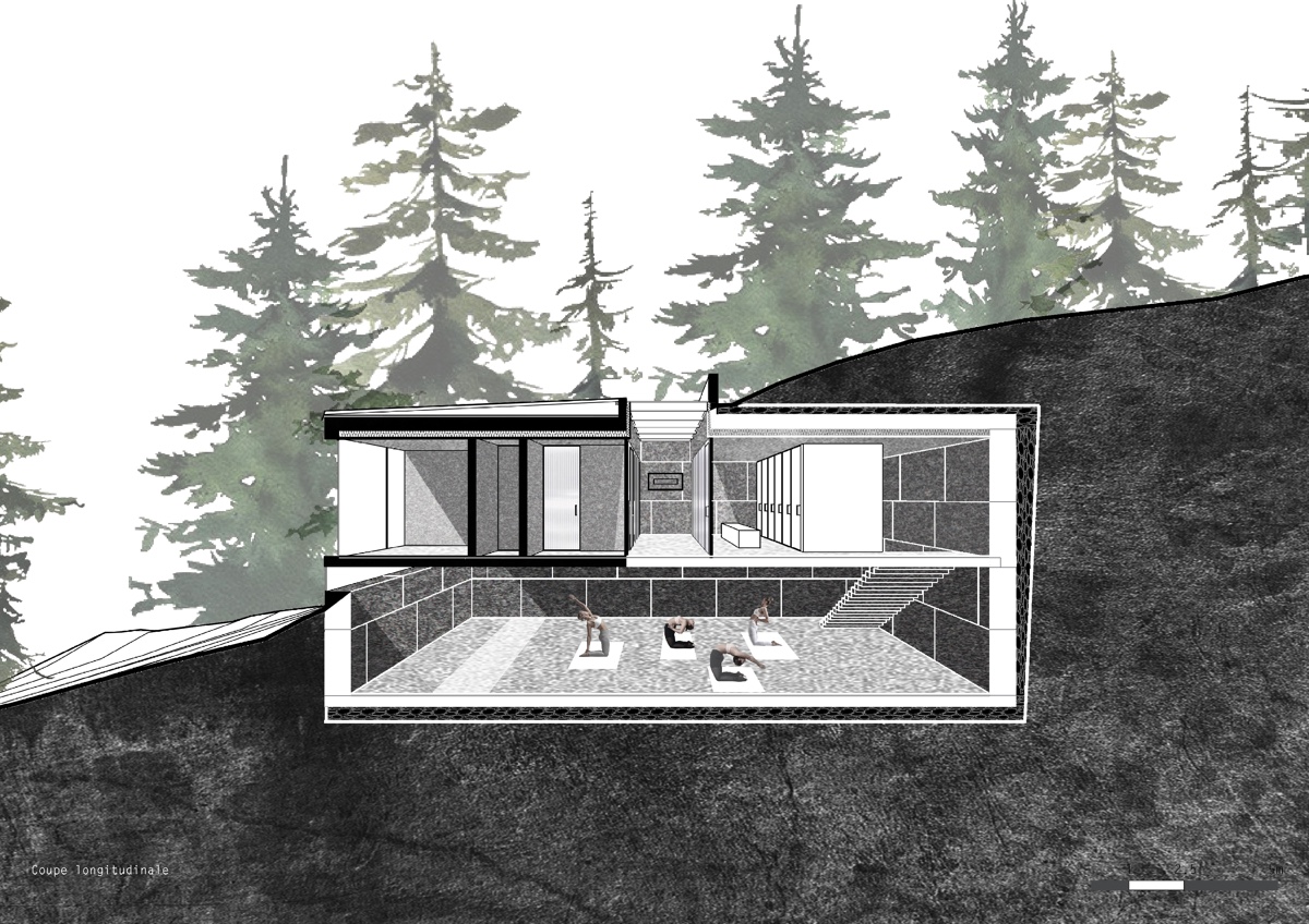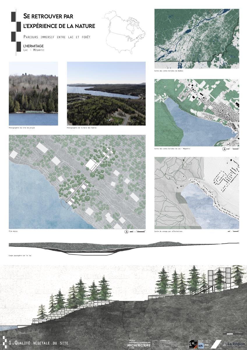 ![]() Lou DurandSe retrouver par l’expérience de la natureParcours immersif entre lac et forêt à Lac-MéganticSi les discours des habitants de Lac-Mégantic sont encore empreints de deuil, neuf ans après la catastrophe ferroviaire, il est possible d’insuffler une nouvelle dynamique à la ville, en se concentrant sur ce qui a été oublié. Les plans d’aménagement se sont focalisés sur la construction d’un nouveau centre-ville et l’aménagement du quartier est. Mais si l’on tourne le regard vers l’extrémité ouest de la ville, un autre paysage se dessine, plus sauvage, plus dépaysant, moins construit. La Baie des Sables est un complexe récréotouristique qui accueille un camping et une plage, mais qui souffre d’un tourisme uniquement saisonnier. Le parcours propose un voyage initiatique à l’essentiel du corps et de l’esprit, s’inspirant des croyances des premières nations, et ponctue d’expériences sensorielles au cœur de la roche granitique. Il permettra à chacun de repenser son rapport à l’environnement, à la nature et son cycle de vie, et peut-être se reconnecter à un mode de vie plus harmonieux avec soi-même et les éléments naturels.