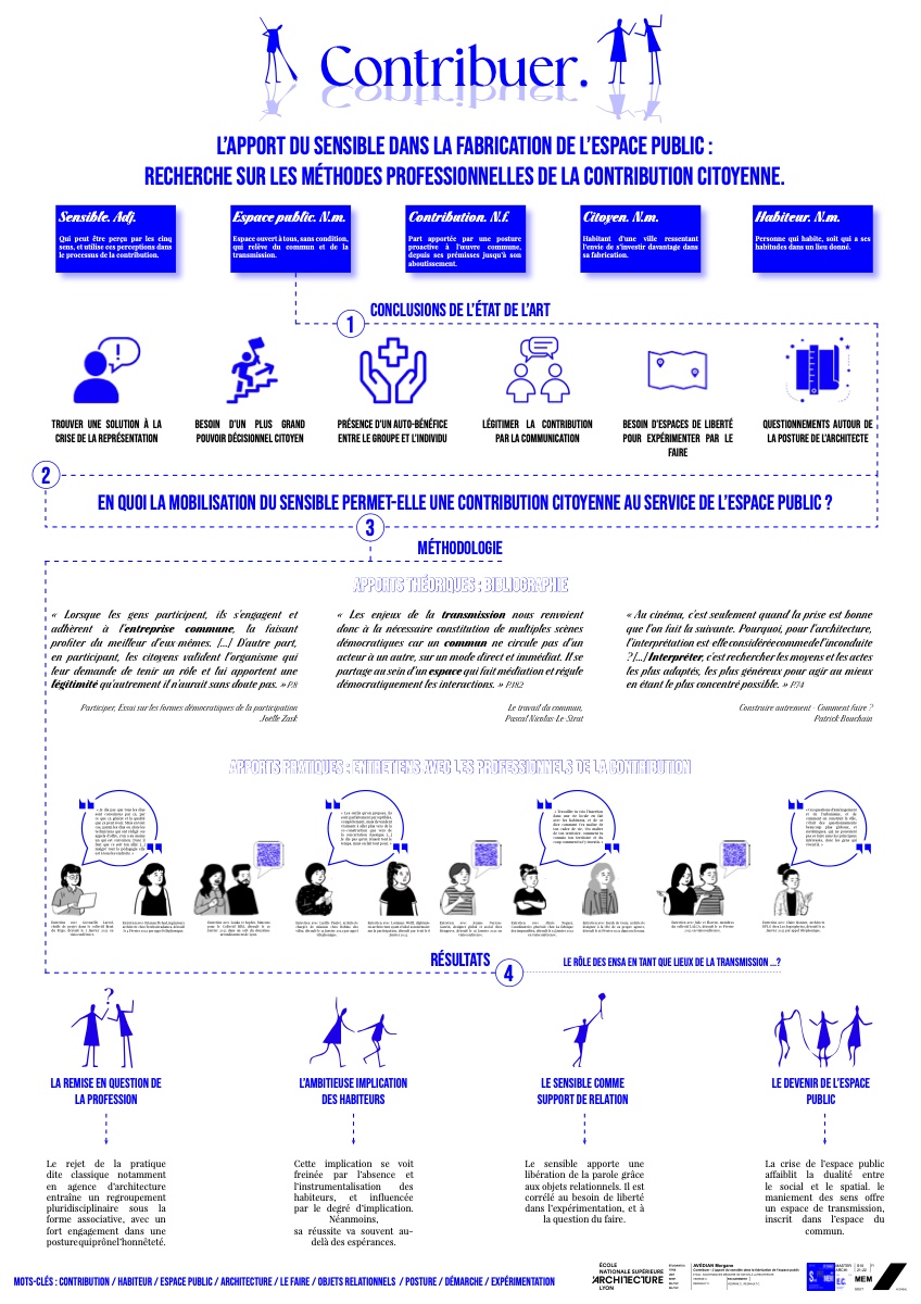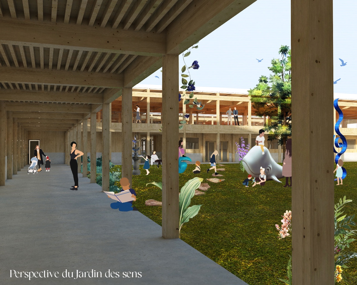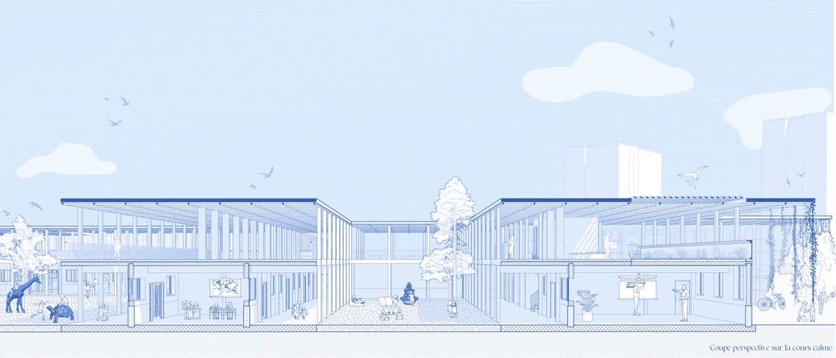 ![]() Morgane AvedianL’école des sensGroupe scolaire au Mas-du-TaureauL’école des sens s’intéresse à la fabrique de Ia viIIe avec I’habitant. Pour ce faire, les élèves du groupe scoIaire Youri Gagarine, impIanté au Mas-du-Taureau, ont été interrogés sur Ieur vision de I’écoIe idéaIe. Le quartier porte Ie projet ambitieux de devenir un écoquartier dans Ie proIongement de Ia rénovation urbaine engagée il y a vingt ans. Il doit répondre à I’impIantation d’une couIée verte en Iien avec des modes doux, en racontant I’eau dans Ie territoire de Grande lIe. Les espaces paysagers ainsi que Ia trame verte doivent être Ies supports d’un projet centré autour de I’accueiI de I’enfant, son développement et I’expression de ses pratiques. Cette écoIe des sens doit être un espace dans IequeIles enfants déveIoppent Ieurs capacités sensorieIIes, inteIIectueIIes et physiques. Enfin, Ia dimension écoIogique est mise en avant à travers des instaIIations qui encouragent Ie déveIoppement de Ia biodiversité et favorisent des apports natureIs dont Ia présence est primordiaIe pour obtenir un véritable dépIoiement de Ia faune et Ia flore au sein du programme.