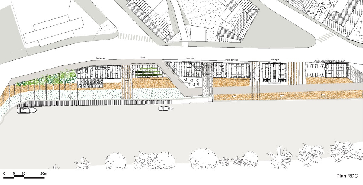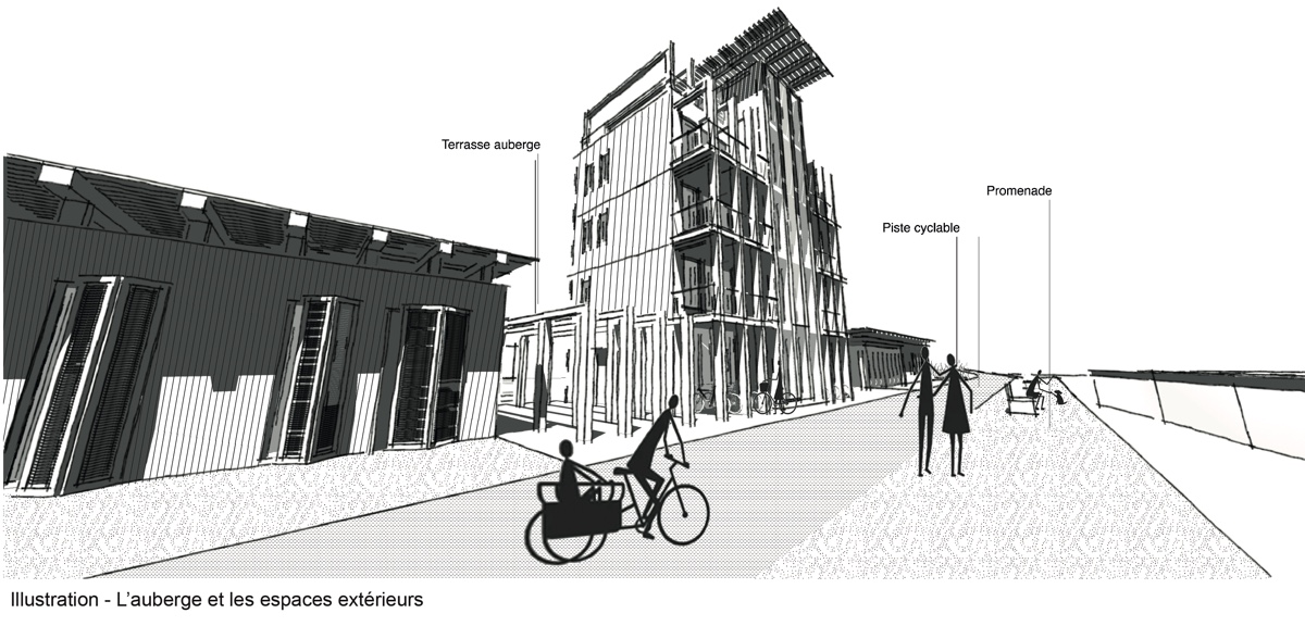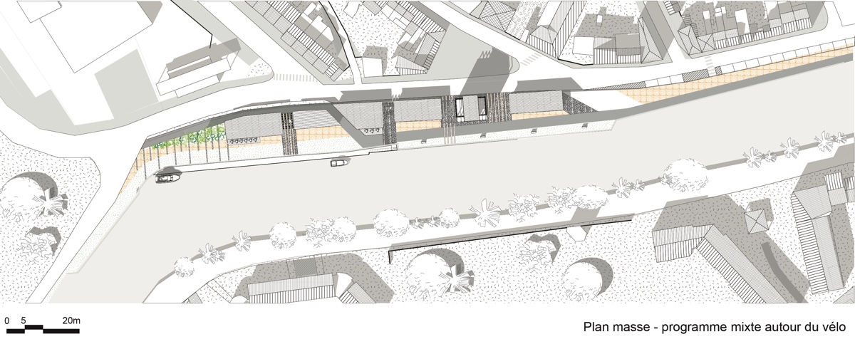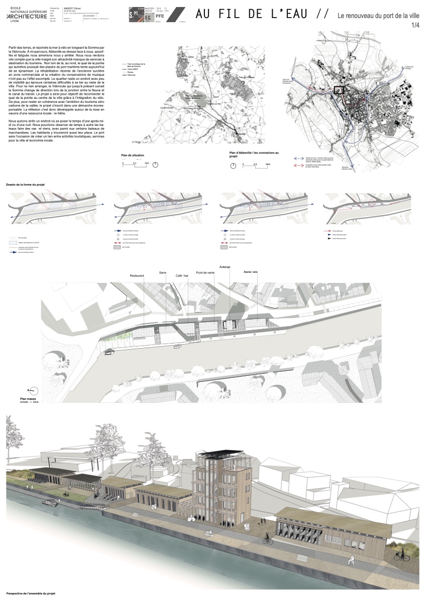 ![]() Chloé AngotAu fil de l’eauRenaissance du port d’AbbevillePartir des terres, et rejoindre la mer à vélo en longeant la Somme par la Véloroute. À mi-parcours, se dresse Abbeville, bien qu’attractif, mais avec peu de services toursistiques. Non loin de là, au nord, le quai de la pointe qui autrefois jouissait des plaisirs du port maritime tente aujourd’hui de se dynamiser. La réhabilitation récente de l’ancienne sucrière en zone commerciale et la création du conservatoire de musique n’ont pas eu l’effet escompté. Le quartier reste un endroit avec peu de visibilité qui éprouve certaines difficultés à se lier au reste de la ville. Pour ne rien arranger, la Véloroute qui jusqu’à présent suivait la Somme change de direction lors de la jonction entre le fleuve et le canal du transit. Au fil de l’eau a ainsi pour objectif de reconnecter le quai de la pointe au centre de la ville grâce à l’intégration du vélo. Le projet s’inscrit dans une démarche écoresponsable, en s’appuyant sur une ressource locale : le hêtre.