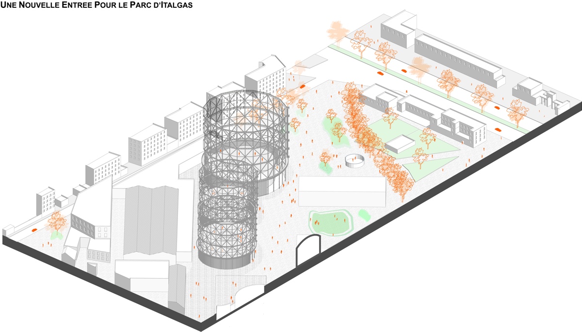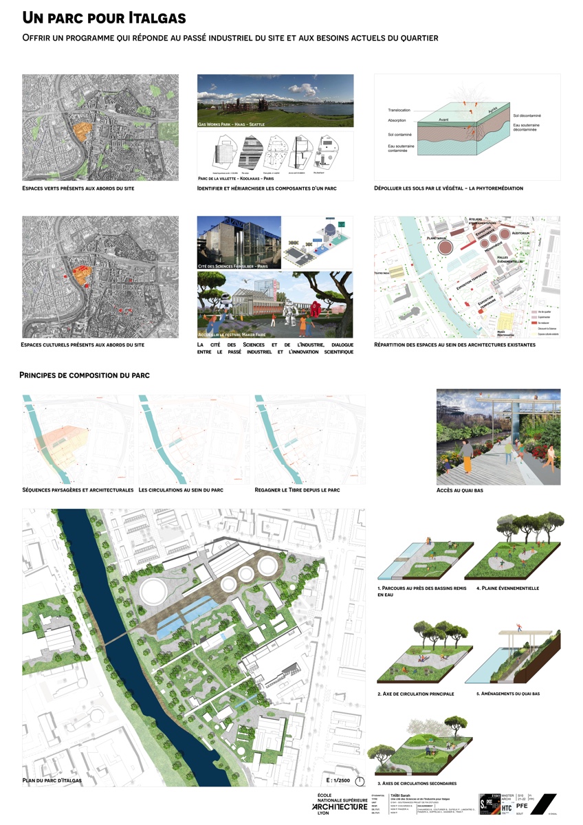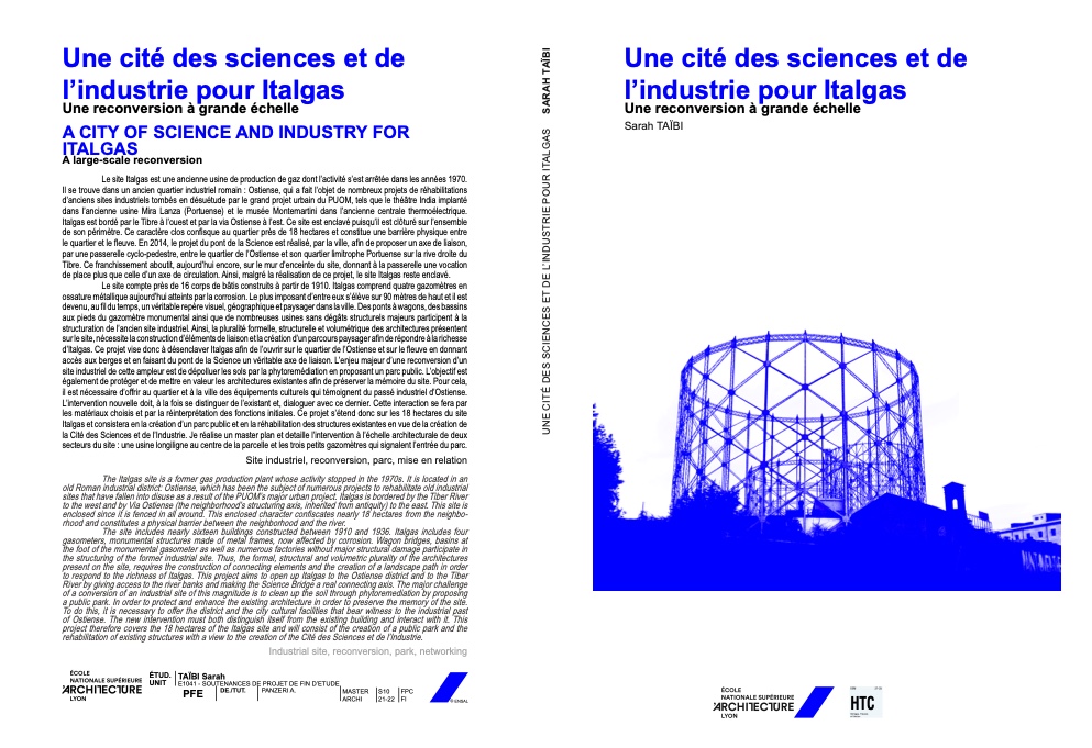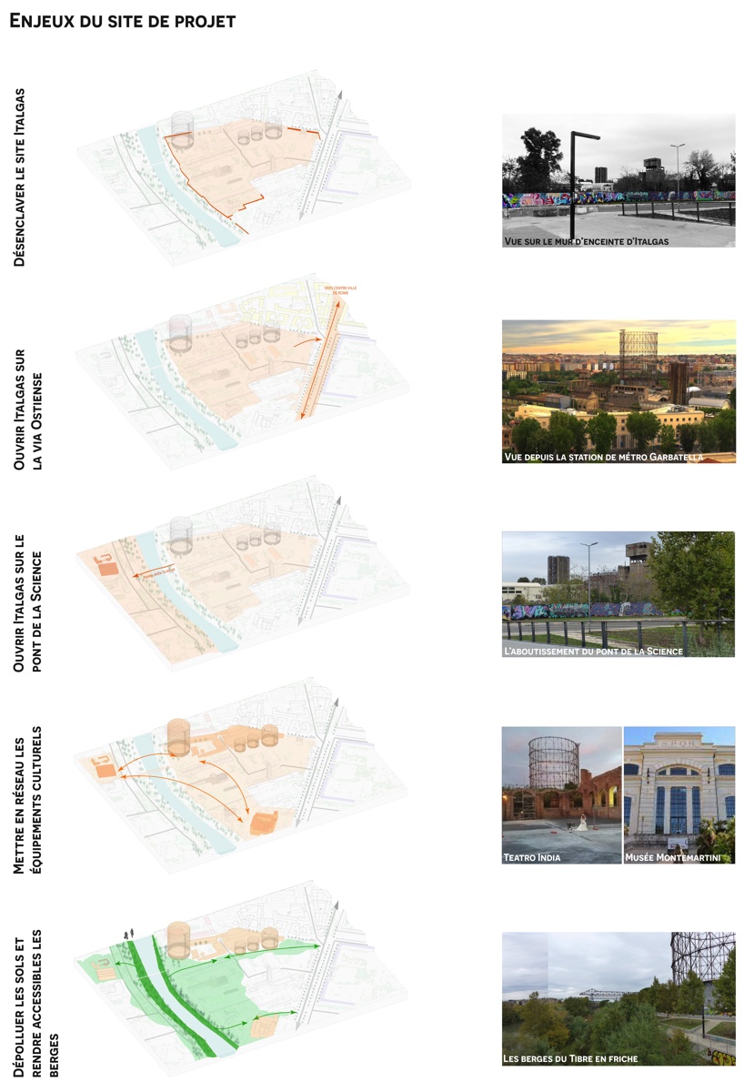 ![]() Sarah TaïbiUne cité des sciences et de l’industrie pour ItalgasUne reconversion à grande échelleLe site Italgas est une ancienne usine de production de gaz, situé dans un ancien quartier industriel romain Ostiense, bordé par le Tibre et par la via Ostiense. Le caractère clos constitue une barrière physique. En 2014, le projet du pont de la Science est réalisé afin de proposer un axe de liaison, par une passerelle cyclo-pédestre. Ce franchissement aboutit sur le mur d’enceinte du site, donnant à la passerelle une vocation de place plus que celle d’un axe de circulation. Le site compte près de seize corps de bâtis, quatre gazomètres en ossature métallique aujourd’hui atteints par la corrosion. Le plus imposant d’entre eux s’élève sur 90 mètres de haut et il est devenu, au fil du temps, un véritable repère visuel. L’enjeu majeur est de dépolluer les sols par la phytoremédiation. Le projet consiste en la création d’un parc public et en la réhabilitation des structures existantes en vue de la création de la Cité des Sciences et de l’Industrie : une usine longiligne au centre de la parcelle et les trois petits gazomètres qui signalent l’entrée du parc.