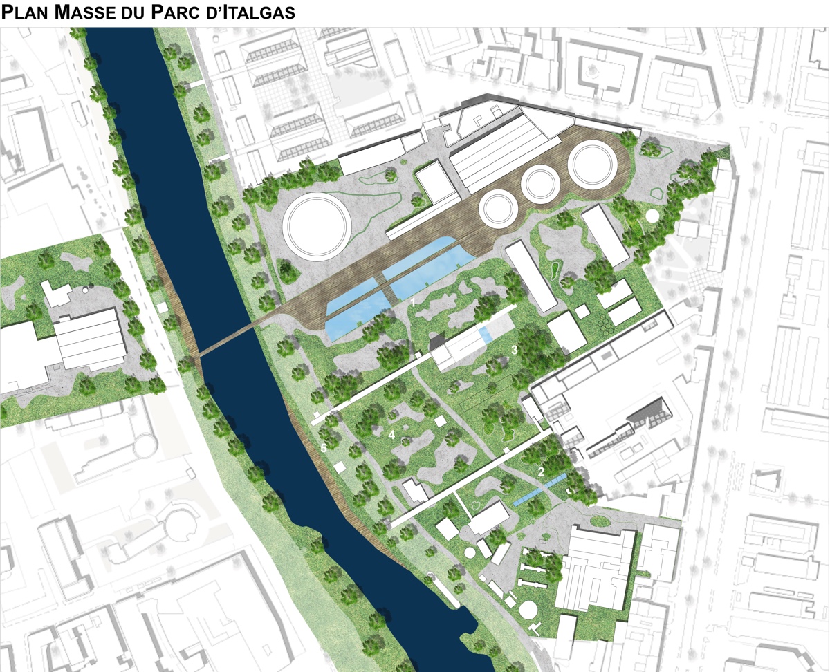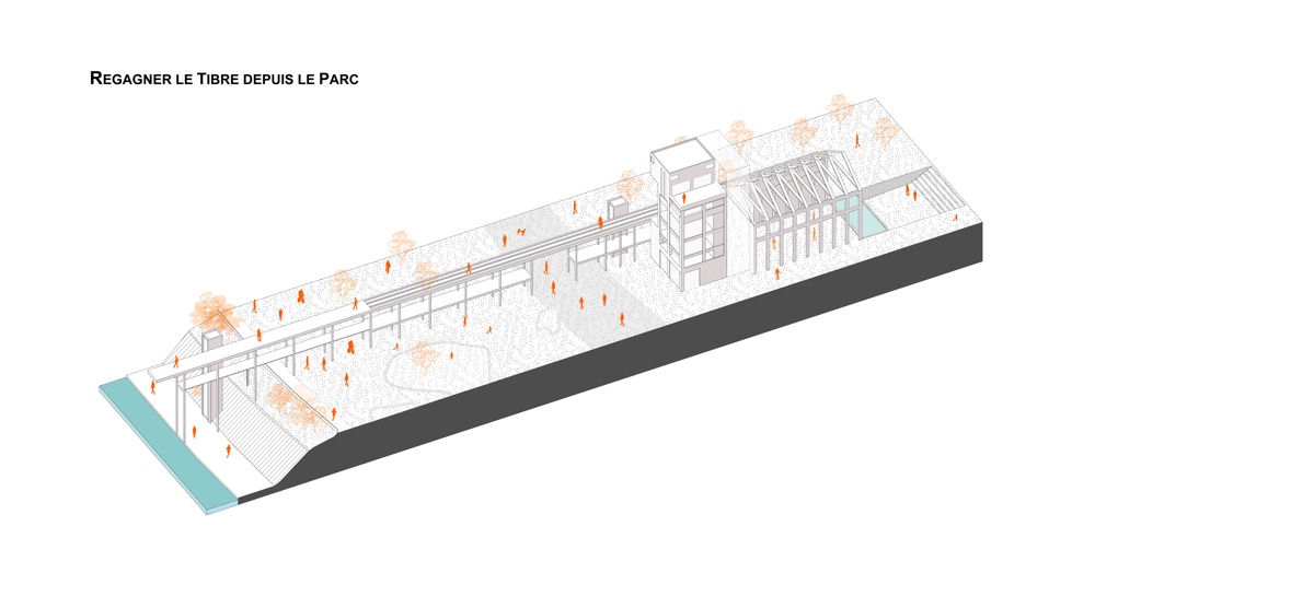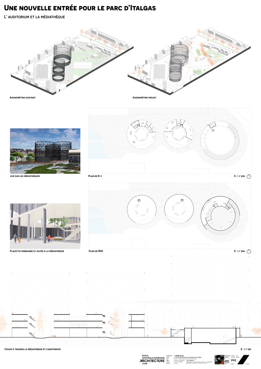 ![]() Sarah TaïbiUne cité des sciences et de l’industrie pour ItalgasUne reconversion à grande échelleLe site Italgas est une ancienne usine de production de gaz, situé dans un ancien quartier industriel romain Ostiense, bordé par le Tibre et par la via Ostiense. Le caractère clos constitue une barrière physique. En 2014, le projet du pont de la Science est réalisé afin de proposer un axe de liaison, par une passerelle cyclo-pédestre. Ce franchissement aboutit sur le mur d’enceinte du site, donnant à la passerelle une vocation de place plus que celle d’un axe de circulation. Le site compte près de seize corps de bâtis, quatre gazomètres en ossature métallique aujourd’hui atteints par la corrosion. Le plus imposant d’entre eux s’élève sur 90 mètres de haut et il est devenu, au fil du temps, un véritable repère visuel. L’enjeu majeur est de dépolluer les sols par la phytoremédiation. Le projet consiste en la création d’un parc public et en la réhabilitation des structures existantes en vue de la création de la Cité des Sciences et de l’Industrie : une usine longiligne au centre de la parcelle et les trois petits gazomètres qui signalent l’entrée du parc.