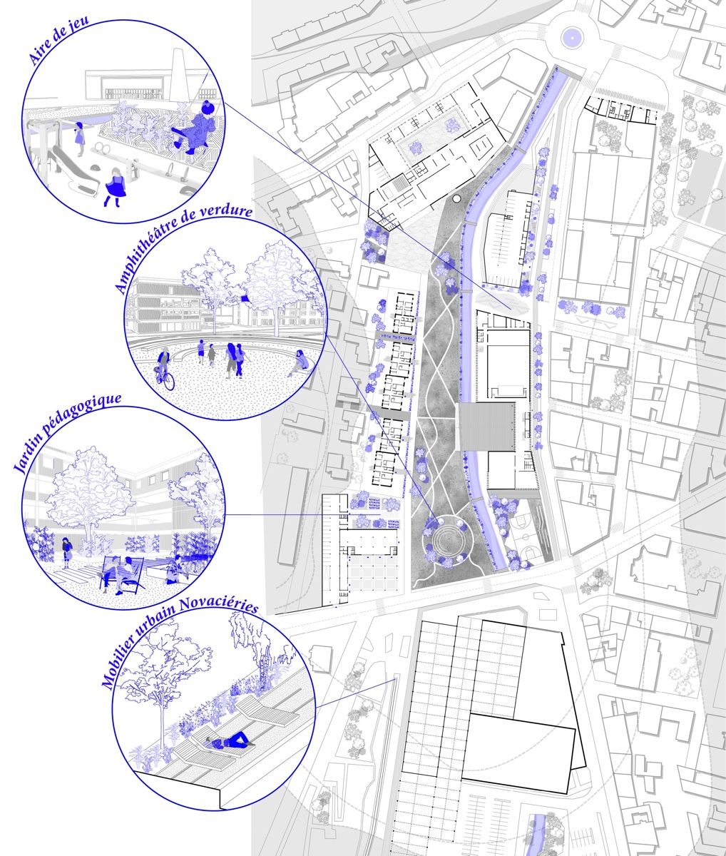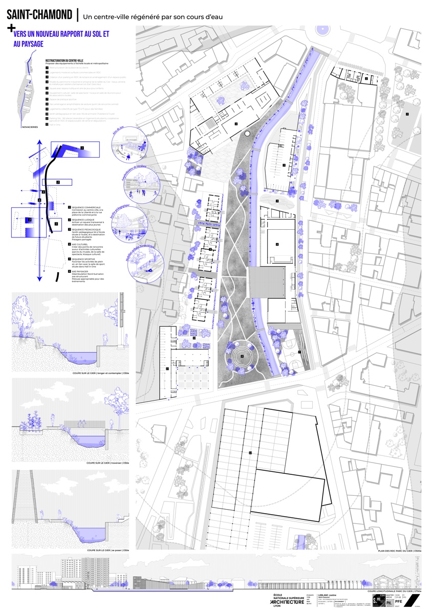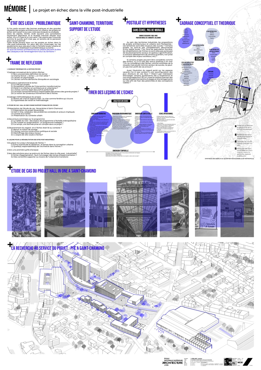 ![]() Justine LeblancVers une régénération des villes post- industrielles sous l’impulsion métropolitaineRevalorisation des séquences urbaines et paysagères à Saint-ChamondSituée dans la vallée du Gier, Saint-Chamond a vu s’installer au 19e siècle de nombreuses industries. Le développement s’est fait rapidement, créant un parc industriel, vaste tènement de près de 45 hectares. C’est en 2000, que cette friche est déclarée d’intérêt communautaire. Ainsi sort de terre en 2018 le projet Hall in One, pôle de loisir et pôle commercial de près de 10 000 m2. Or, à peine 6 mois après son ouverture, le projet est un échec. Afin de reconnecter la ville aux métropoles de Lyon et de Saint-Étienne, le quartier de la gare est restructuré en vue de l’installation d’un pôle tertiaire. Support d’accueil de bureaux, plateaux techniques d’expérimentation, d’un Fab Lab et d’espaces événementiels, il aura un rôle d’interconnexion entre les quartiers. Le projet restructure le centre-ville avec la redécouverture du Gier. Des programmes culturels mixtes sont développés. Enfin, un parking silo réversible en logements étudiants et des logements collectifs donnant sur le parc urbain et sa rivière prennent place à proximité de Hall in One.