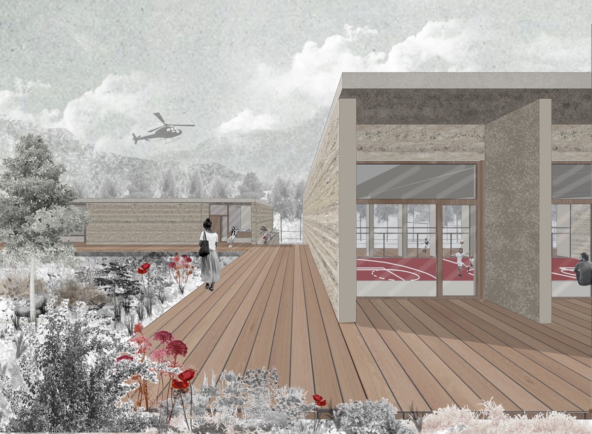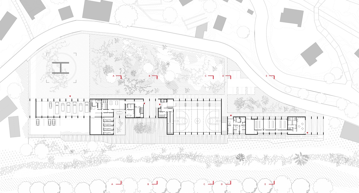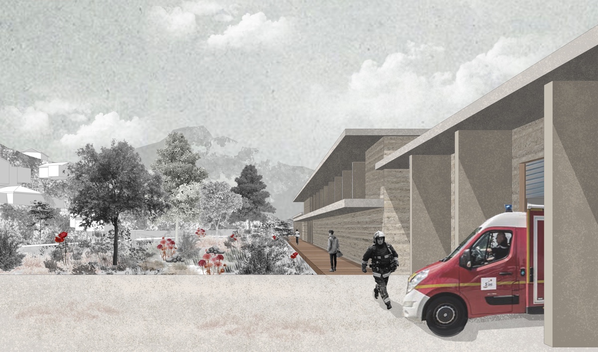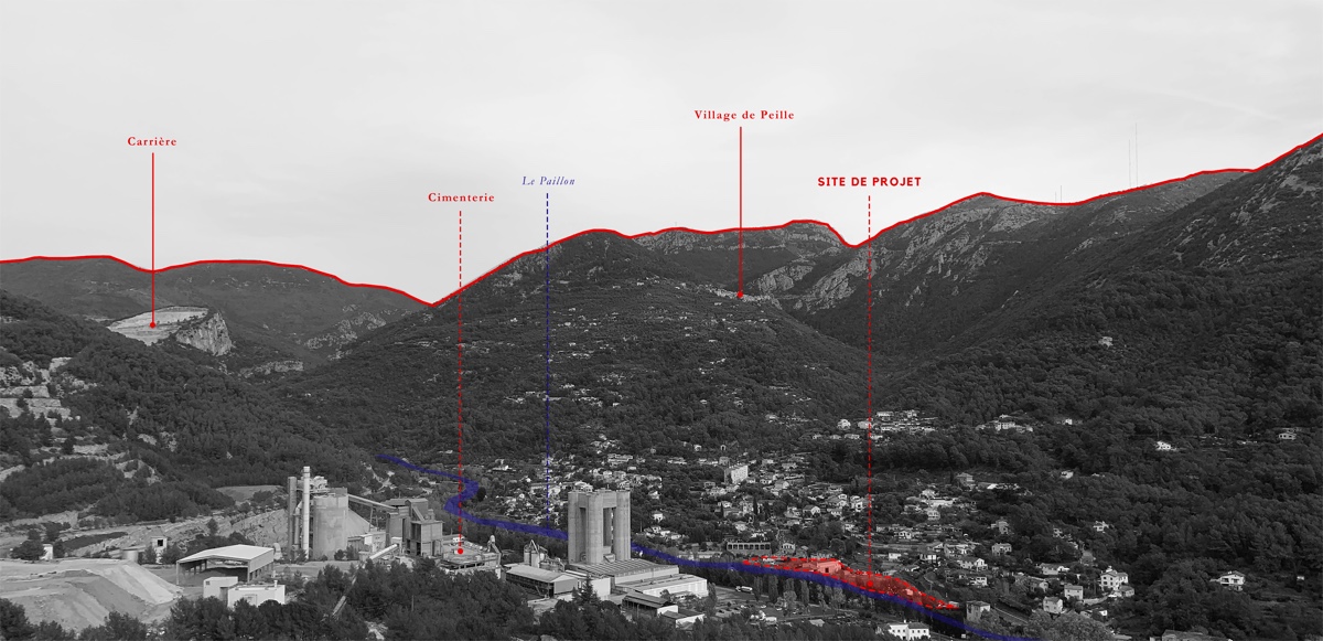 ![]() Mathilde GrancherFaire faceUn centre de secours en lien avec son milieuFaire face se situe dans un fond de vallée, le long du fleuve Paillon à la Grave de Peille, un hameau dortoir de l’arrière-pays niçois marqué par la cimenterie Vicat. L’usine et les carrières génèrent des tensions d’échelles et de paysages avec le village constitué d’un tissu pavillonnaire ouvrier. L’industrie est marquée par d’imposantes émergences verticales, et de fortes cicatrices topographiques, produisant un paysage anthropisé et stratifié au sein duquel le Paillon peine à exister. Dans un village où la nature est écrasée par l’infrastructure, et menacée par les risques naturels et technologiques du territoire, comment permettre au village la réappropriation du Paillon ? Redessinant la rive par une ligne longue de 200 mètres, Faire face vise à rendre tangible l’interface que constitue le Paillon entre village habité et milieu naturel. Le projet s’inscrit sur les traces de l’ancien lit du Paillon, détourné pour les besoins de la cimenterie dans les années 1950. Il redonne à voir le sol, à la fois comme support et ressource, profitant de l’industrie locale pour mettre en œuvre un béton de site.