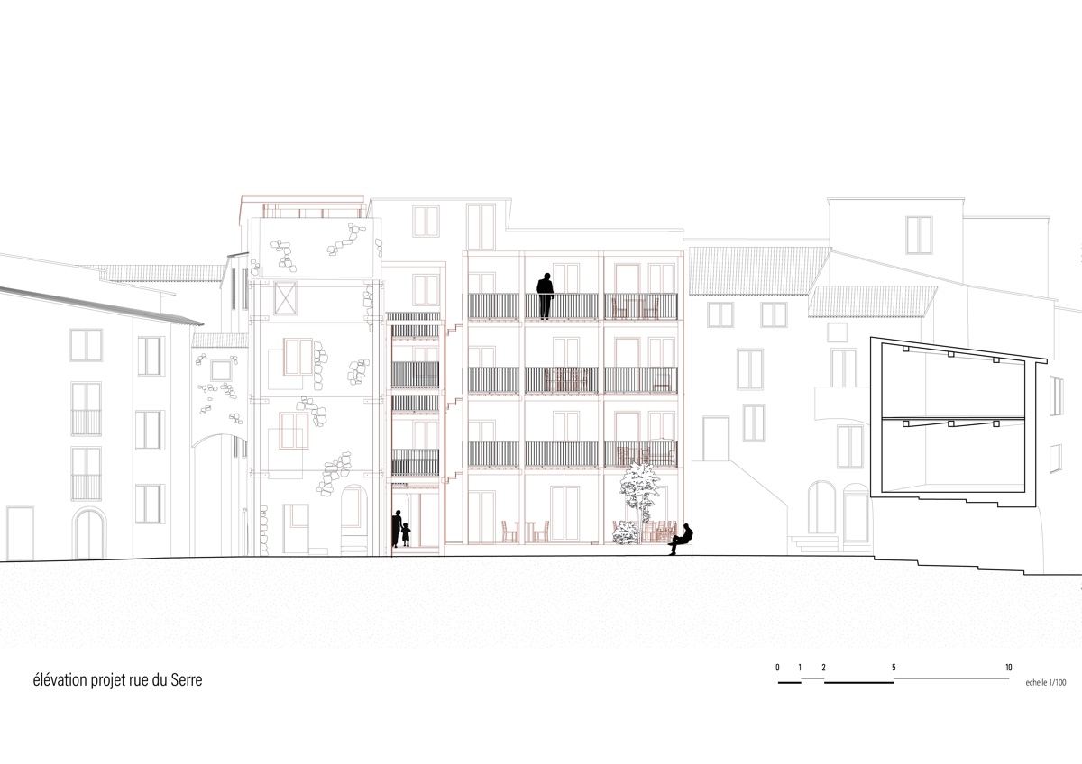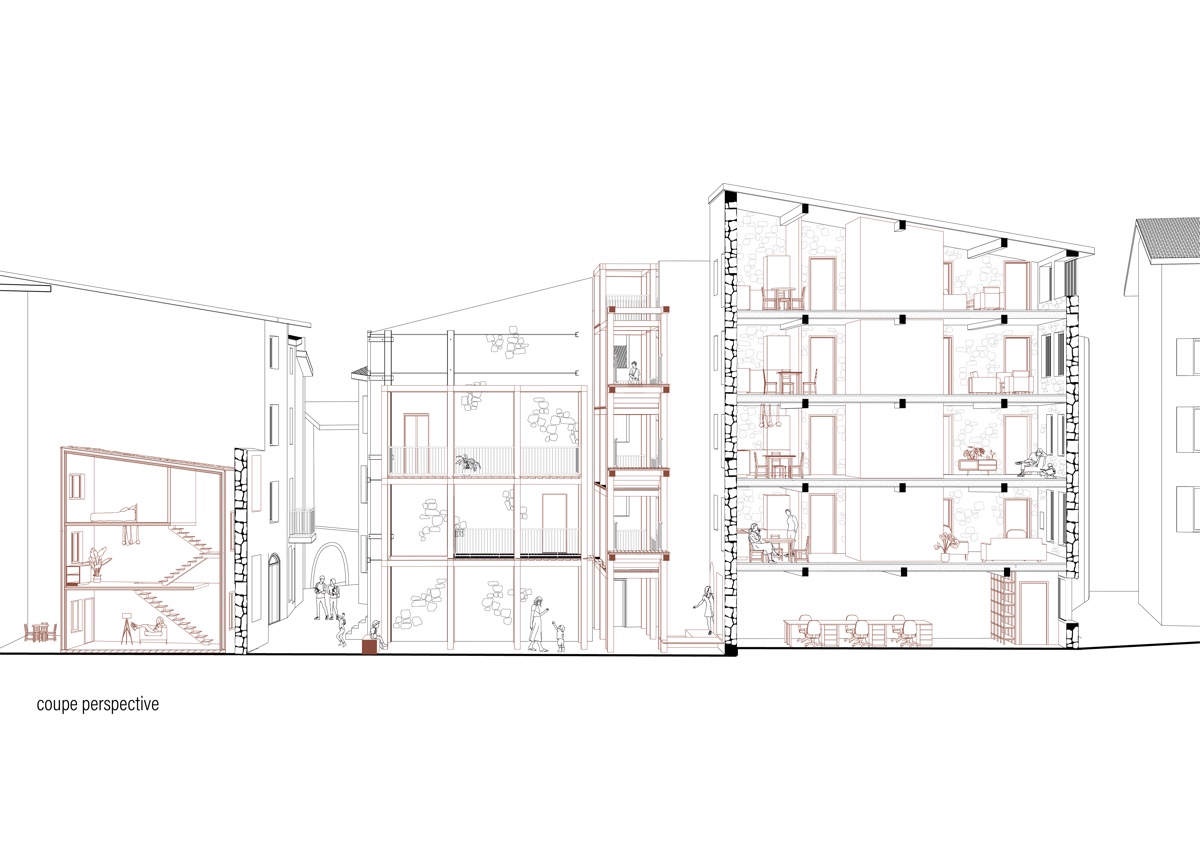 ![]() Mélissa Faraut(Re)composer avec l’existant en milieu denseHabiter le centre-bourg de l’Escarène(Re)composer avec l’existant en milieu dense prend place dans le centre-bourg de l’Escarène, village pittoresque des Alpes-Maritimes situé dans la vallée du Paillon. Les étroites ruelles pavées et les bâtiments en pierre sont caractéristiques de ce centre ancien et confèrent au village une identité particulière. Bien qu’étant dense, le centre bourg est pourtant composé de nombreux bâtis vacants qui le rendent vulnérable et fragilisent la structure de l’existant. Dans ce village peu à peu délaissé par ses habitants, comment le tissu du centre bourg ancien peut-il répondre aux besoins de logement ? Le projet architectural vise à respecter le patrimoine bâti, tout en requalifiant les espaces existants pour les adapter aux besoins des modes de vie contemporains et aux enjeux de durabilité.