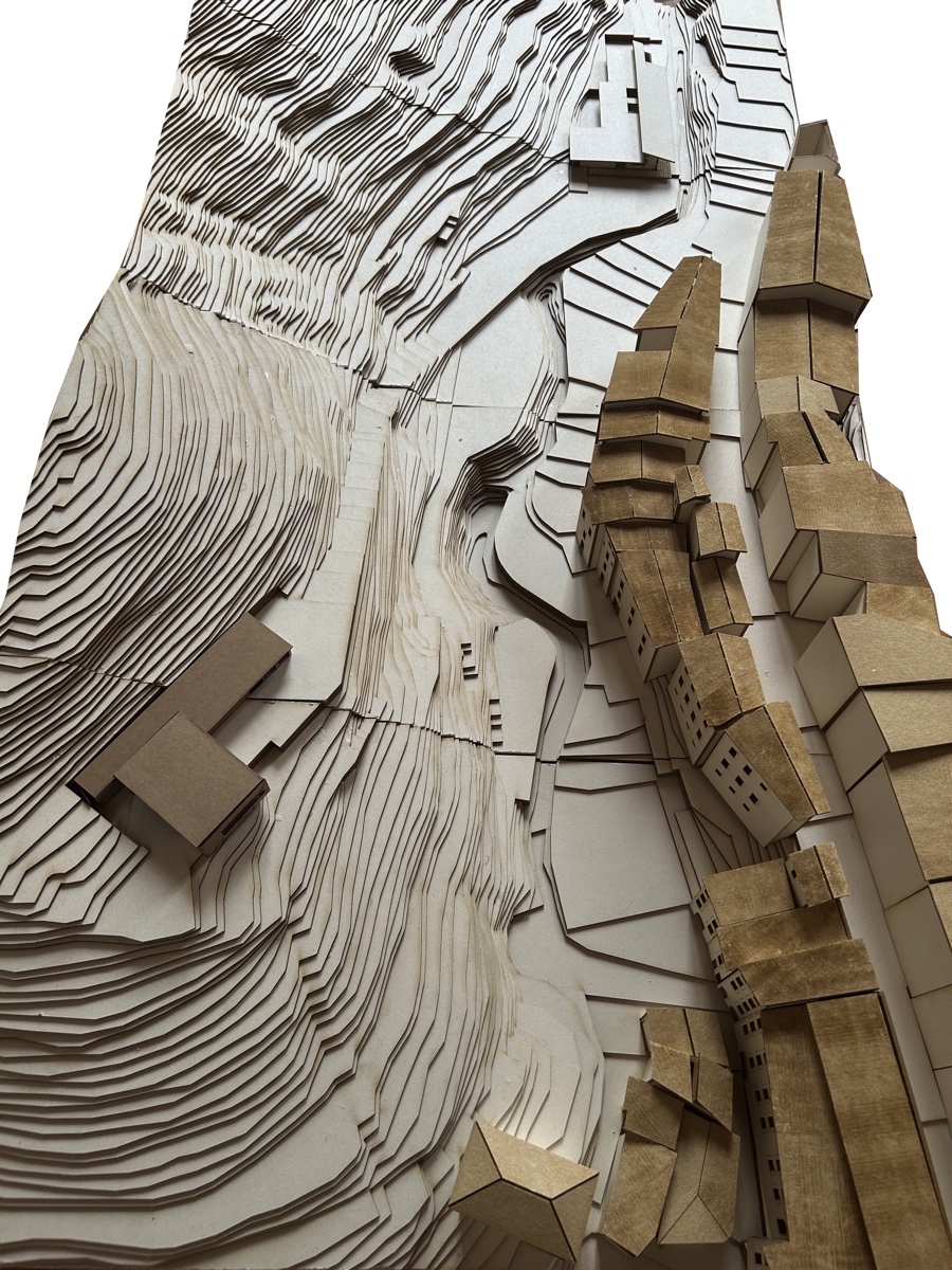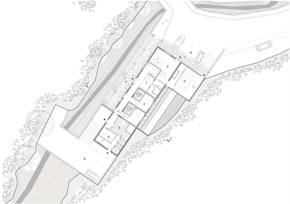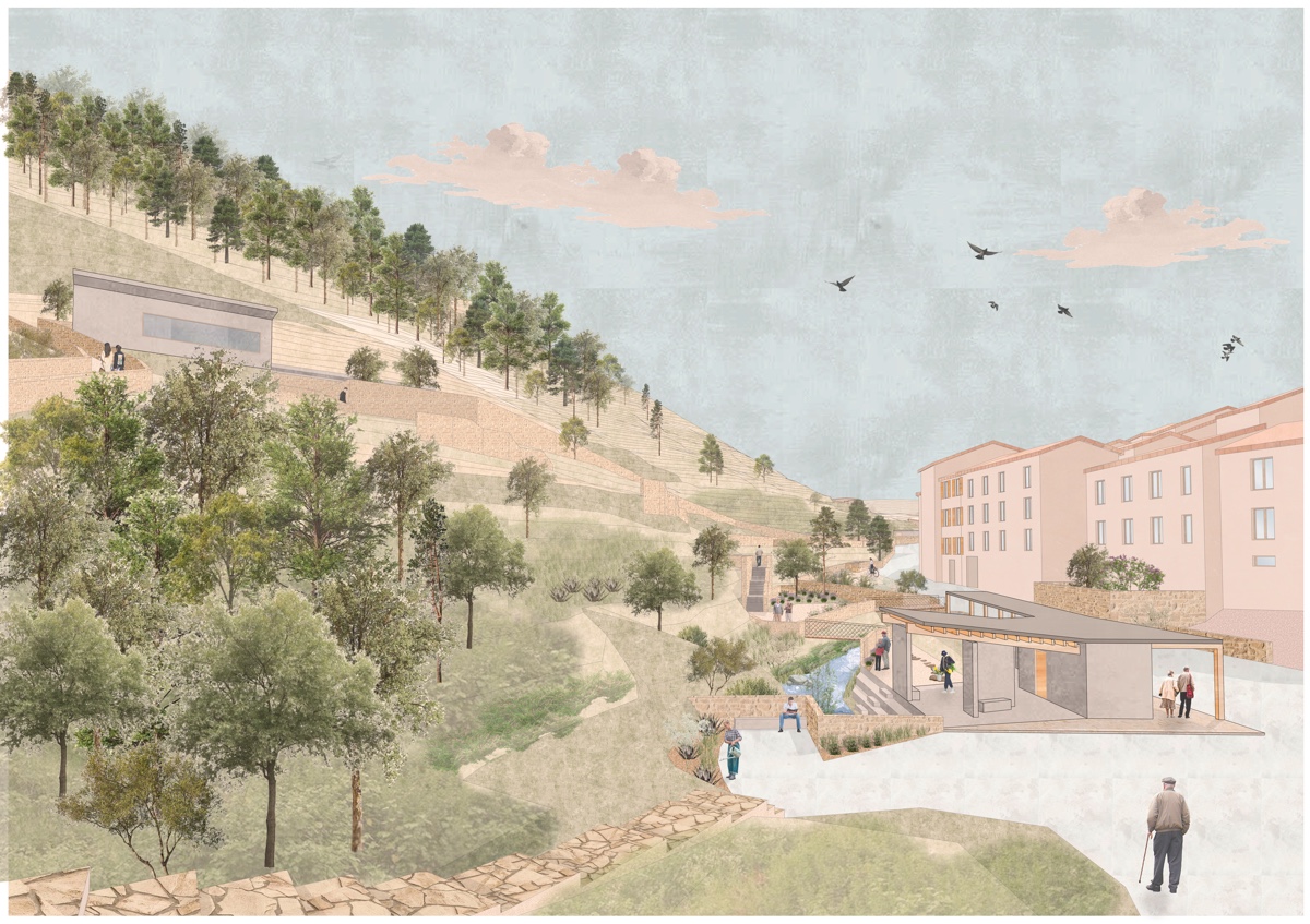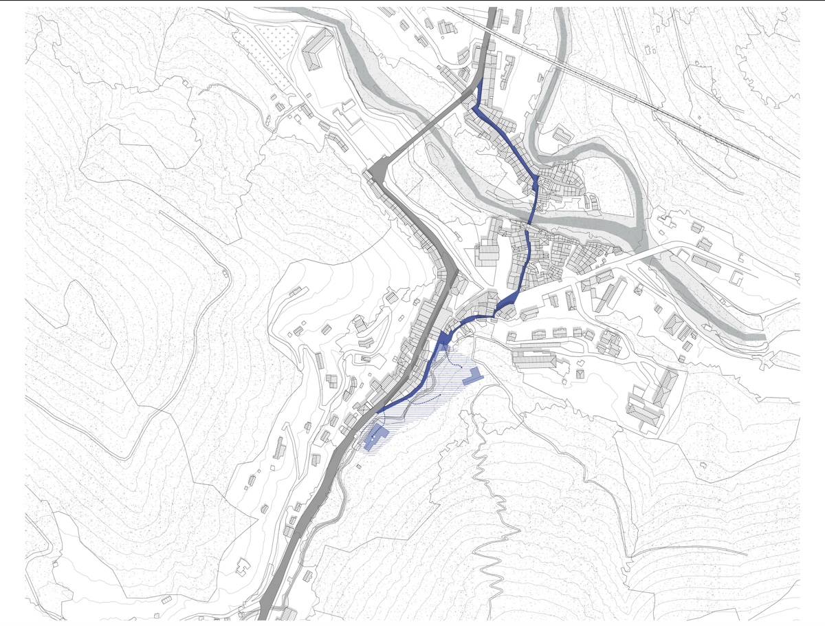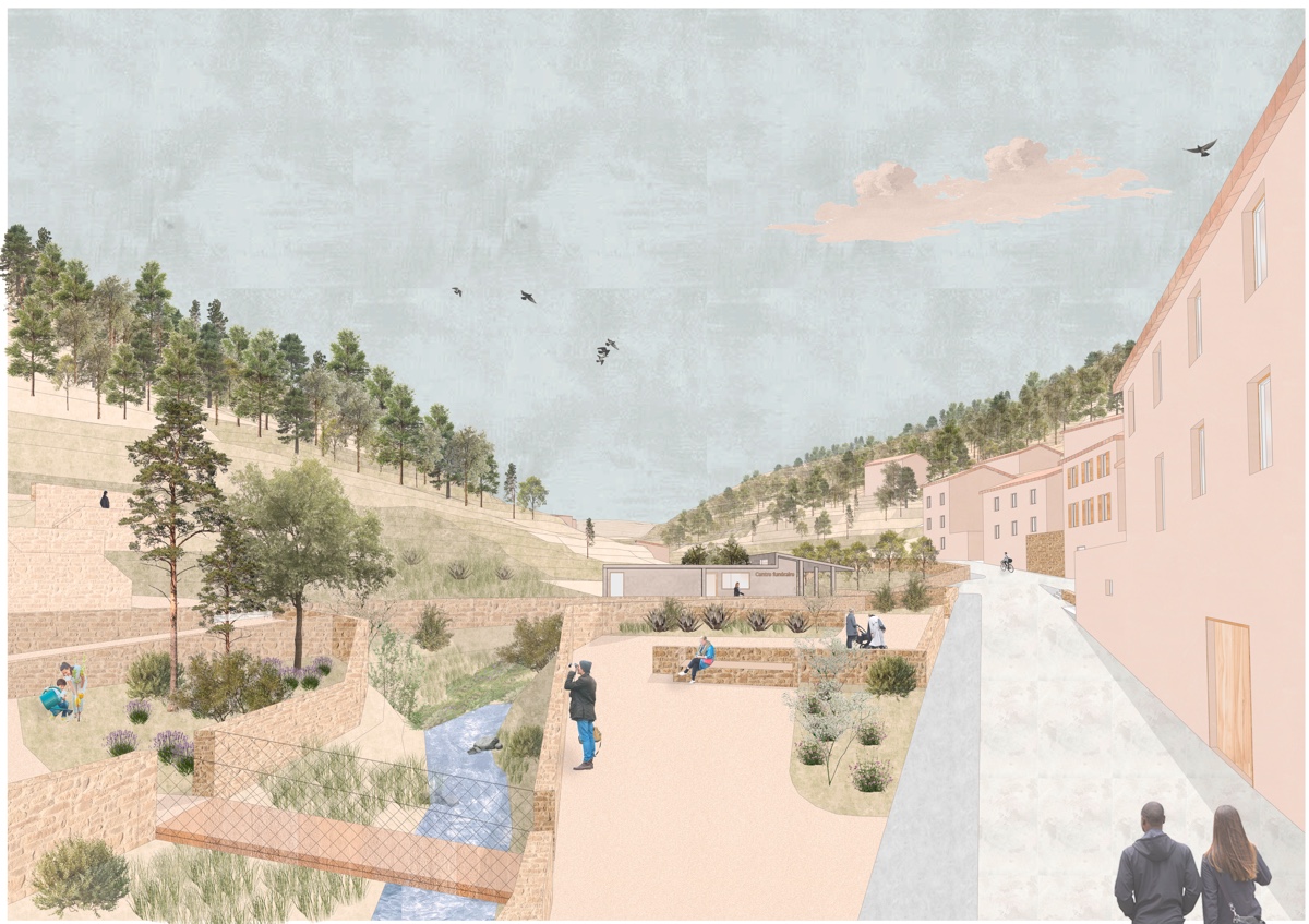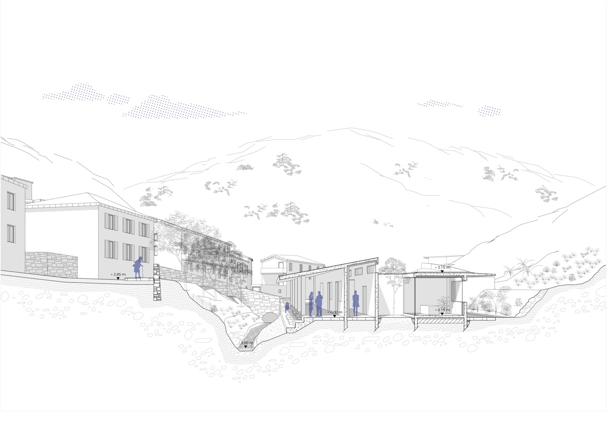![]() Tom FavelJardins funérairesRenouvellement de la rue de Nice à l’EscarèneAutrefois passage obligé de la route du sel pour rentrer dans le village de l’Escarène, la rue de Nice entretient un rapport particulier avec celui-ci : à la fois proche, mais aussi délaissée et en retrait au profit de la rue du Château. Réinvestir un programme symboliquement fort dans ce lieu en fond de vallée a pour objectif d’impulser de nouvelles dynamiques urbaines, paysagères et sociales dans le village. Jardins funéraires appelle à reconfigurer la relation au deuil et au passage de la mort en inscrivant trois interventions architecturales de petite échelle dans un grand jardin, espace de recueillement et de souvenirs. Extrêmement contraint par la topographie, le site se développe dans l’épaisseur entre le front bâti unilatéral de la rue de Nice, le ruisseau et le vallon. Sa position géographique permet d’offrir tantôt des vues sur les alentours, tantôt le repli et l’enfouissement. Ainsi, chacune des situations instruit un récit architectural différent suivant le programme, avec comme appui commun la mise en scène des sols, de l’horizon et du ciel.