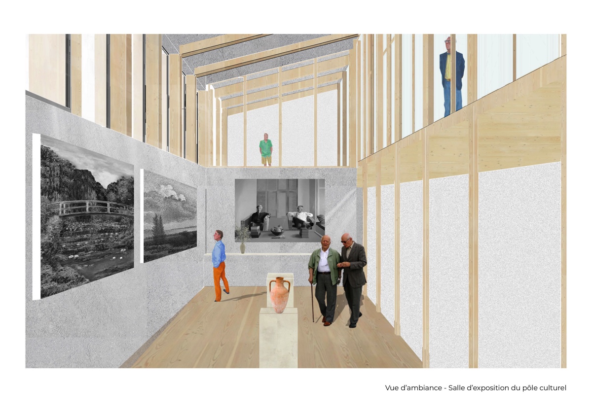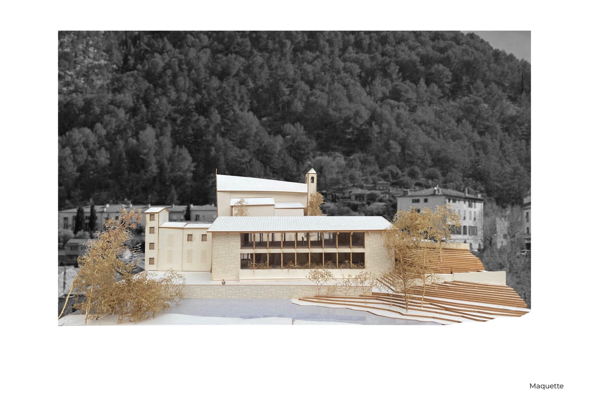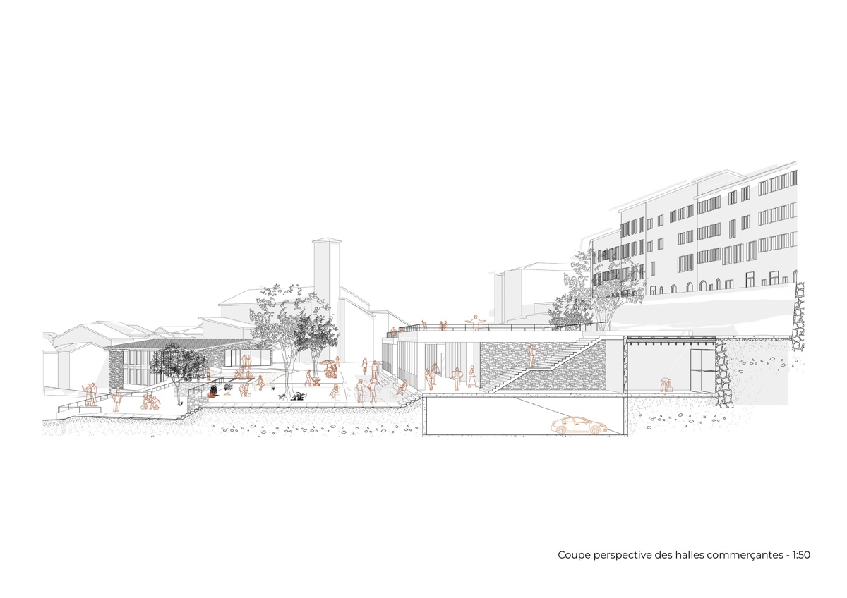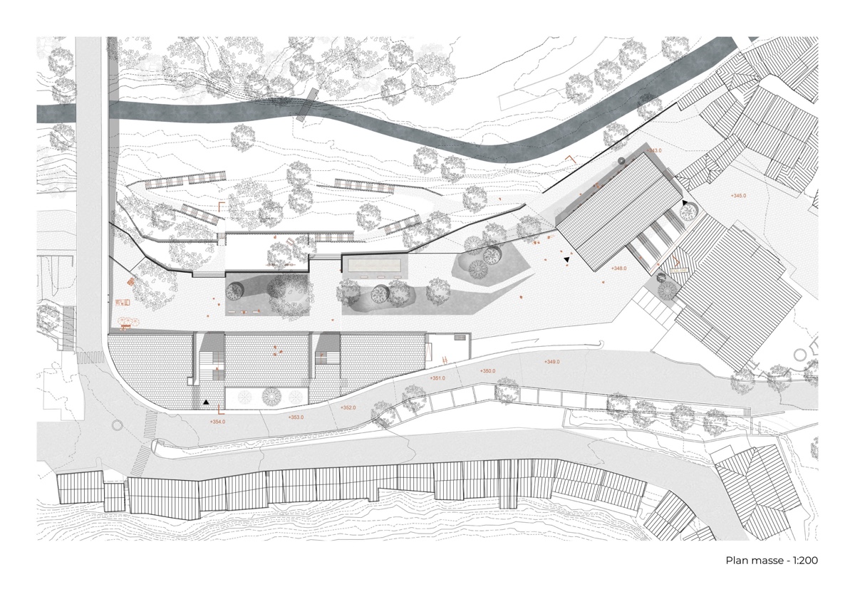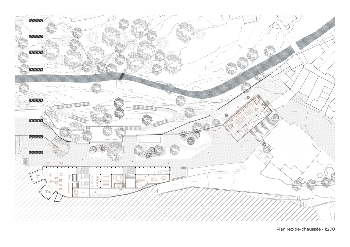 ![]() Diane LenglinLes quais de l’EscarèneLa reconquête de la place Camous et de la médiathèqueLa morphologie de l’Escarène interroge sur les incohérences entre un centre-bourg médiéval dense et très enclavé, une route départementale et l’infrastructure de franchissement du fleuve, le Paillon, en rupture avec la figure historique. La place Camous constitue un grand parking aérien stérile d’une surface de 5000 m2, empêchant toute aménité dans un contexte naturel à fort potentiel (présence de l’eau et de sa végétation en contrebas). Les quais de l’Escarène engage une réflexion architecturale multiscalaire. L’échelle macro du pont et de la départementale qui devient support et mur de soutènement pour installer une halle marchande ouverte et un parking souterrain. L’échelle intermédiaire du bâti du centre-bourg prolongé avec une nouvelle médiathèque pensée comme outil altimétrique pour gérer les variations de sols aux abords de l’église et de sa place. L’échelle micro des éléments tels que les escaliers, venelles, baies et seuils pour négocier des percées, accès, vues, à l’échelle humaine. Les connexions entre les strates hautes du “quai” et basses du Paillon deviennent possibles. On retrouve l’image perdue des anciennes terrasses plongeant jusqu’à retrouver le contact du fleuve.