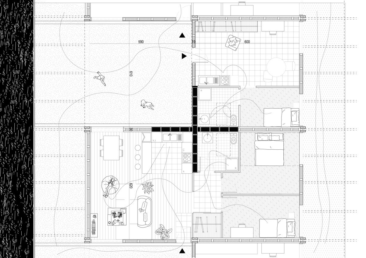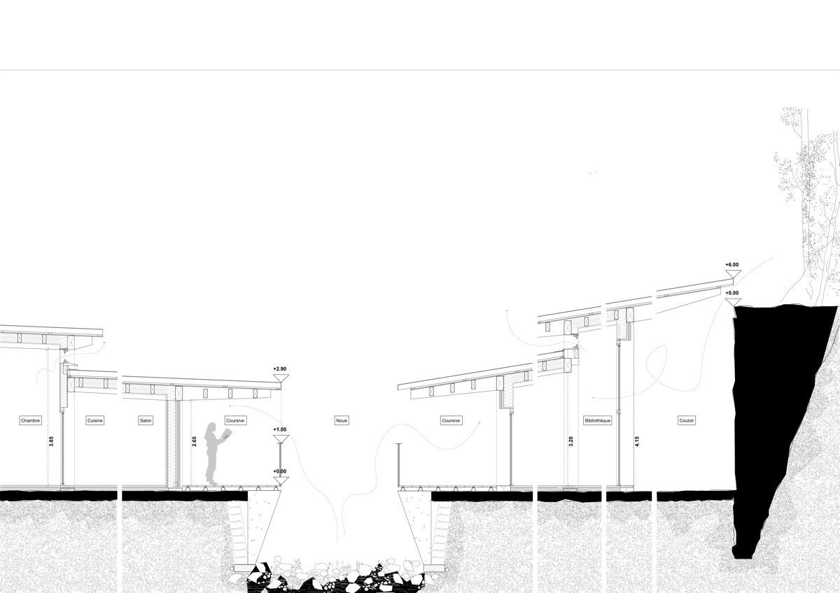![]() Alexandra PetitHabiter l’infrastructure héritéeL’écosystème de la vallée du PaillonLa topographie de La Trinité, commune de l’arrière-pays niçois est façonnée par l’homme. La vallée du Paillon est celle de l’infrastructure entre ses axes de communication, sa gestion de l’eau, son agriculture. Plusieurs systèmes se superposent : un économique avec l’industrie du béton, un écologique avec le bassin-versant du Paillon et un infrastructurel avec la densité du réseau viaire. Le vallon du Papaton accueille une usine de production de parpaings dénaturant son milieu et construite selon une vision ancienne du monde. Si l’infrastructure constitue le nouveau sol, alors l’habiter nécessite quatre dimensions. 1_Le programme : habiter le site en hybridant les systèmes : enseignement / vie / production. 2_Utiliser le socle : Trois socles, dont un radier et un mur de soutènement permettent d’expérimenter trois architectures. La première est d’habiter l’épaisseur du socle. 3_Se poser sur le socle, pour créer une épaisseur habitable. 4_Percer le socle, destiné à réconcilier le milieu dans ses dimensions naturelles et anthropiques.