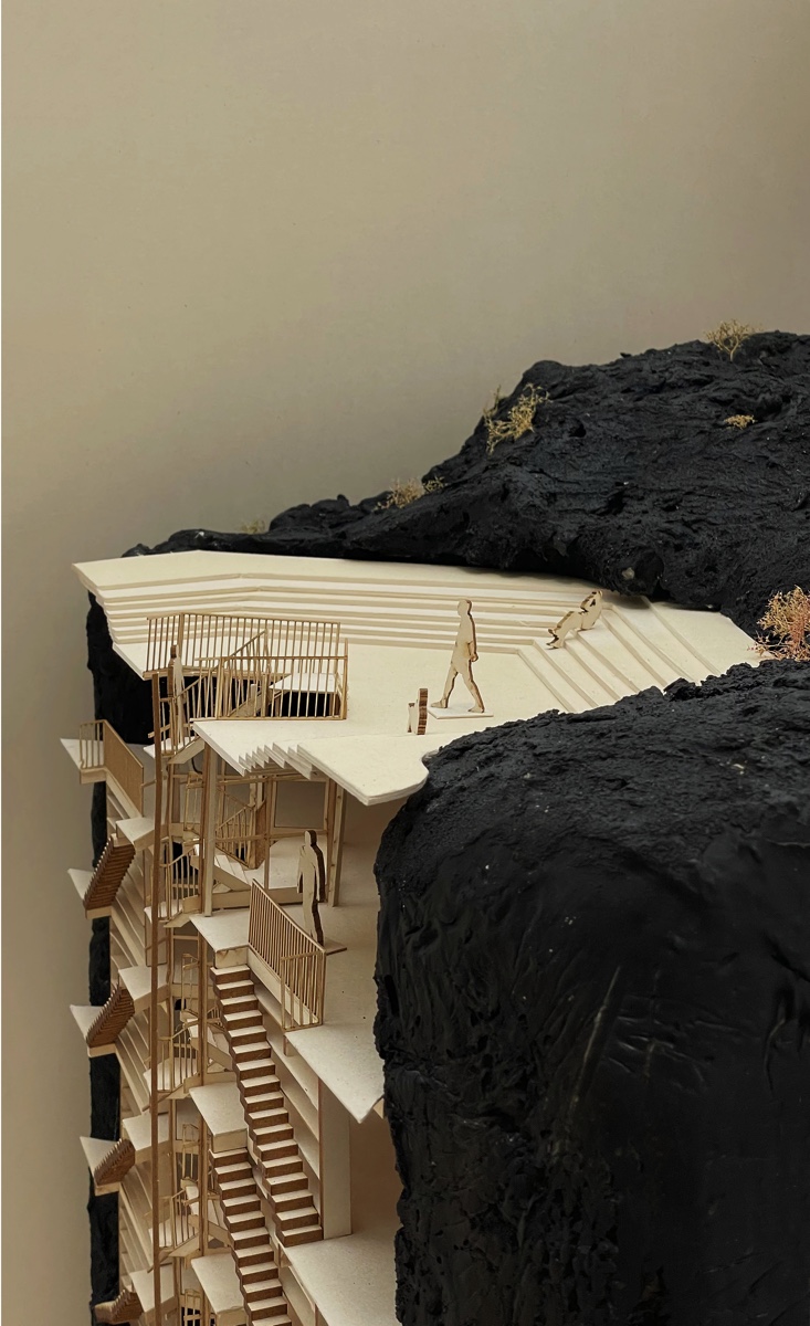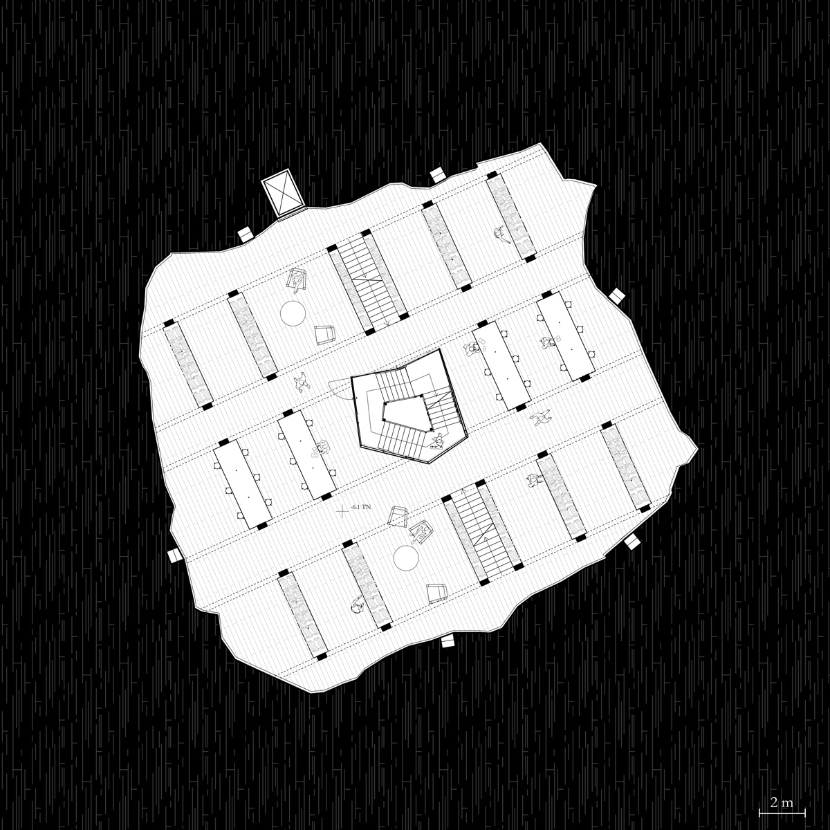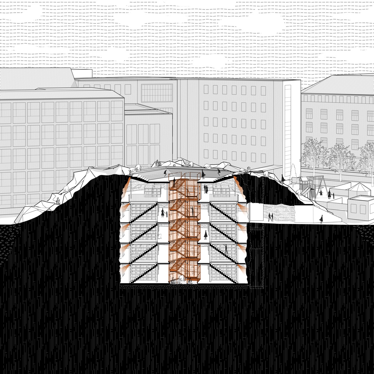 ![]() Laure Bertrand / Cyrielle RozéFragments de l’espace invisibleSynergie spatiale entre dessus et dessousFragments de l’espace invisible prend place dans le centre-ville d’Helsinki, explorant les espaces souterrains. La ville souterraine autarcique n’est pas souhaitable. Il s’agit alors de créer une synergie spatiale équilibrée entre le monde aérien et souterrain. Le projet révèle comment le sous-sol contribue à enrichir la ville en lui conférant une urbanité et en travaillant son lien avec la surface par le dessin soignée des interfaces. Une série de dix projets esquissés, appelés “fragments” de l’espace invisible seront dessinés. Certains des fragments, plus rationnels, répondent à des problématiques durables et urbaines, valorisant le souterrain. D’autres, plus utopiques, offrent un discours critique sur l’usage actuel du souterrain. Marqués par les temps géologiques, ces espaces deviennent des révélateurs de la ville sensible, proposant une vision renouvelée du sous-sol. En faisant appel à l’imaginaire, le projet prend la forme d’un récit où chaque illustration évoque la poésie, la perception et la sensibilité de l’espace souterrain. Une invitation à plonger dans les profondeurs de l’innovation urbaine, où les promesses de demain prennent racine sous les pas.