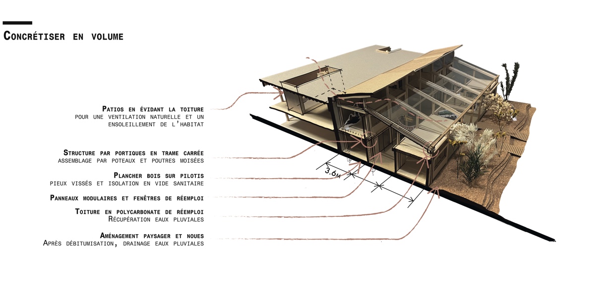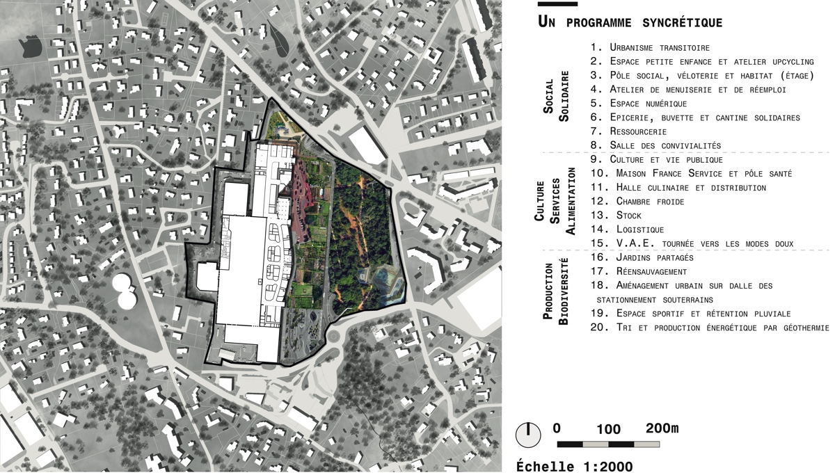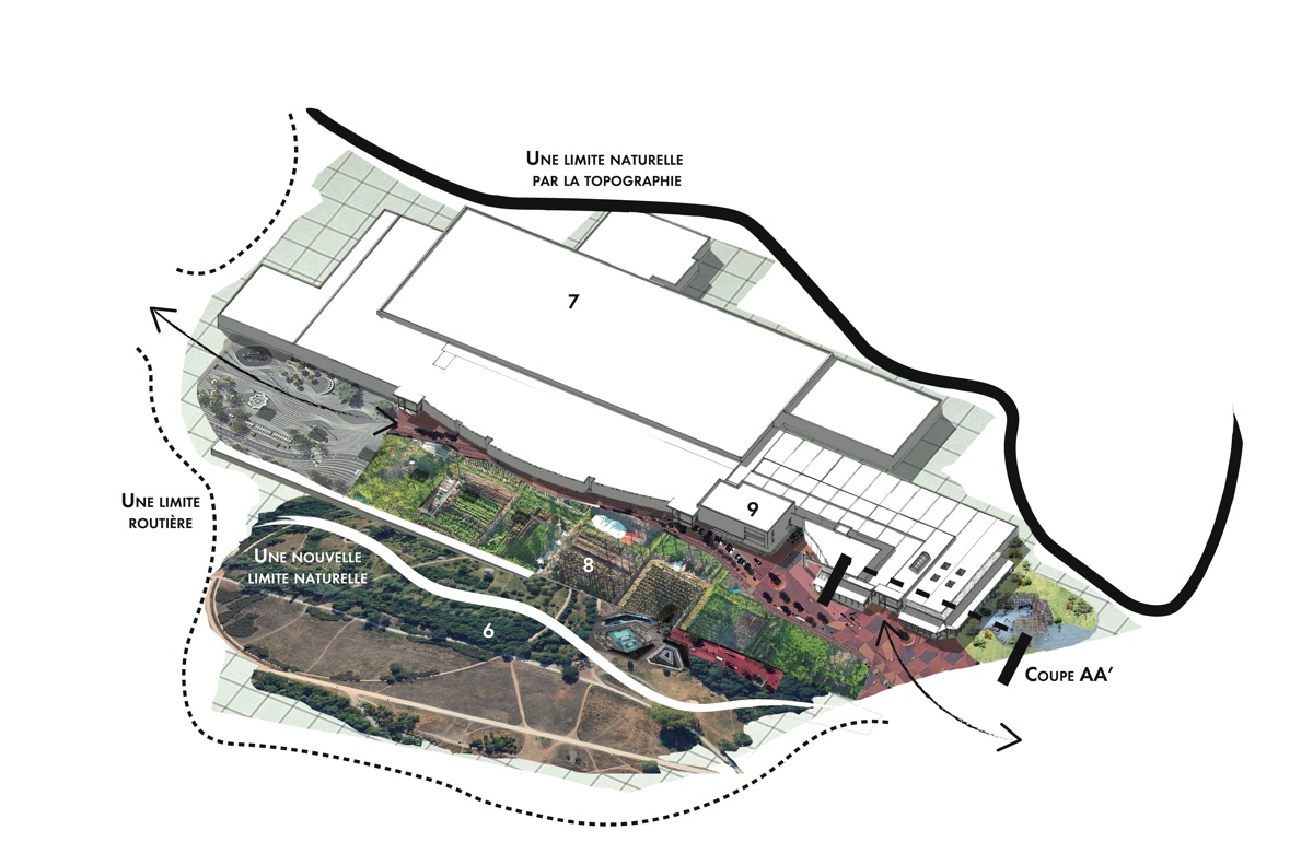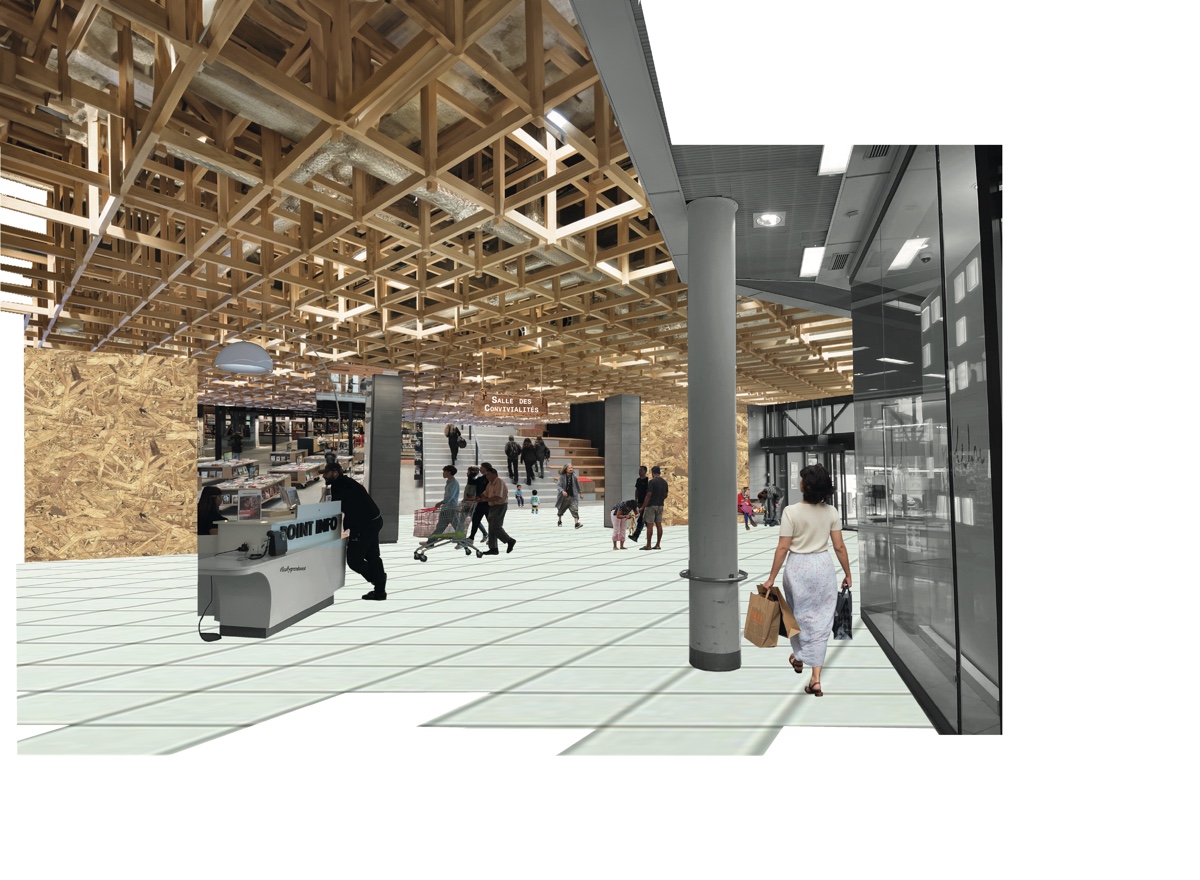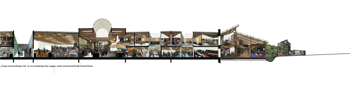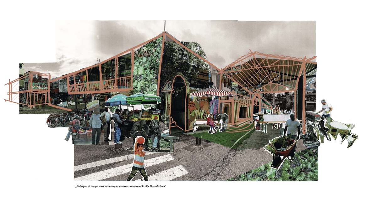 ![]() Charlotte ChanardTerraPolisL’aube d’un nouvel écosystème urbain vivantTerraPolis s’inscrit dans l’intention première de répondre à un sentiment d’inquiétude face à l’avenir. La démarche de conception s’ancre dans une mise en critique de la typologie du centre commercial suburbain. Situé en première couronne lyonnaise, le centre commercial Grand Ouest à Écully met en lumière les tensions politiques et urbanistiques de la périurbanité. En examinant les caractéristiques économiques et morphologiques du centre commercial, il s’agit de révéler les symboles du gigantisme et de l’inégalité sociale. Comment les centres commerciaux peuvent se reconvertir en lieux de vie, en phase avec les enjeux écologiques et sociaux contemporains ? Dans un contexte économique qui peine à envisager un scénario de descente énergétique, TerraPolis cherche à l’accompagner avec une vision prospective. Par un retour au vivant et une proposition architecturale alternative, économique et sociale, qui transpose cette architecture ordinaire comme un fond de scène, le projet cherche à déconstruire l’image des centres commerciaux et à insuffler une nouvelle dynamique conviviale.