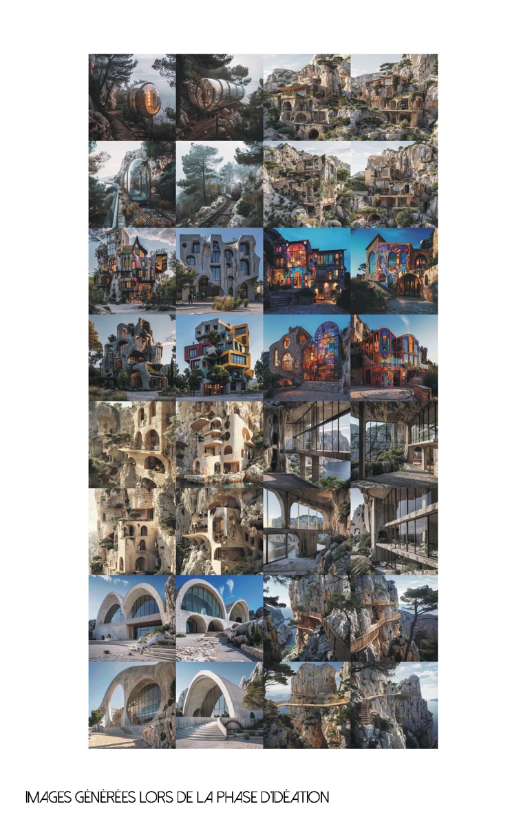 ![]() Marie PhilipL’Escalette augmentée par un générateur d’imagesExpérimentation d’un processus de conception outillé par l’intelligence artificielle générativeLe projet correspond à l’expérimentation d’un processus de conception dans lequel la Friche de l’Escalette est augmentée par l’utilisation d’un générateur d’images. Le site est une ancienne usine à plomb située à l’entrée des Calanques de Marseille. Le contexte patrimonial, historique et paysager de la friche, ainsi que l’accroche personnelle liée à ce site conduisent à choisir ce lieu comme terrain d’expérimentation. Différentes analyses de site servent de données d’entrée pour le générateur d’images. L’expérimentation de l’outil explore plusieurs échelles de projet, et le processus de conception se poursuit avec une phase de réappropriation des résultats grâce au dessin à la main. Différentes mises en architecture qui sortent de l’ordinaire ressortent de cette expérimentation, permettant d’ouvrir des possibilités pour l’avenir de la friche.