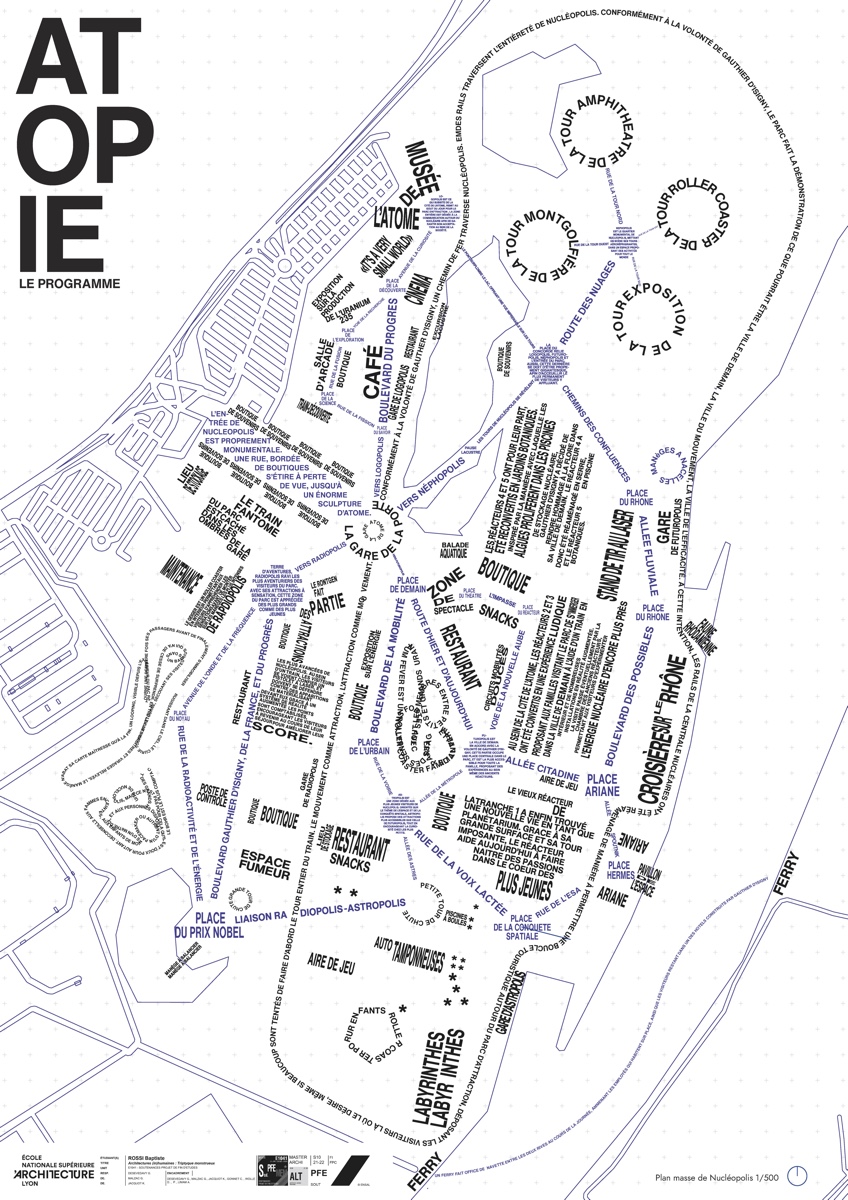 ![]() Baptiste RossiNucléopolisRéhabilitation et reconversion d’une centrale nucléaire en parc d’attractionAu sein d’une uchronie où le choc pétrolier de 1973 fut encore plus violent, un plan Messmer renforcé a été mis en place. Nucléopolis raconte l’histoire d’une France ayant un rapport au nucléaire, où ce dernier est un élément du quotidien, voire une attraction célébrée à part entière. Se basant sur la Centrale nucléaire de production d’énergie du Bugey à Saint-Vulbas, Nucléopolis est composée de cinq zones thématisées de manières différentes, proposant ainsi un parc d’attraction et de découverte sur les berges du Rhône, aux interfaces des flux et des imaginaires. Destiné aux petits et grands, Nucléopolis met à profit son passé de centrale nucléaire afin de se réapproprier les tours aéroréfrigérantes et les réacteurs, de manière à créer une expérience tout à fait unique. Un des enjeux du projet est de questionner le rapport actuel au nucléaire, à travers la juxtaposition d’un programme ludique et de la gravité que convoque l’énergie nucléaire. Le projet est plus destiné aux habitants d’aujourd’hui, plutôt qu’à ceux de 2066.