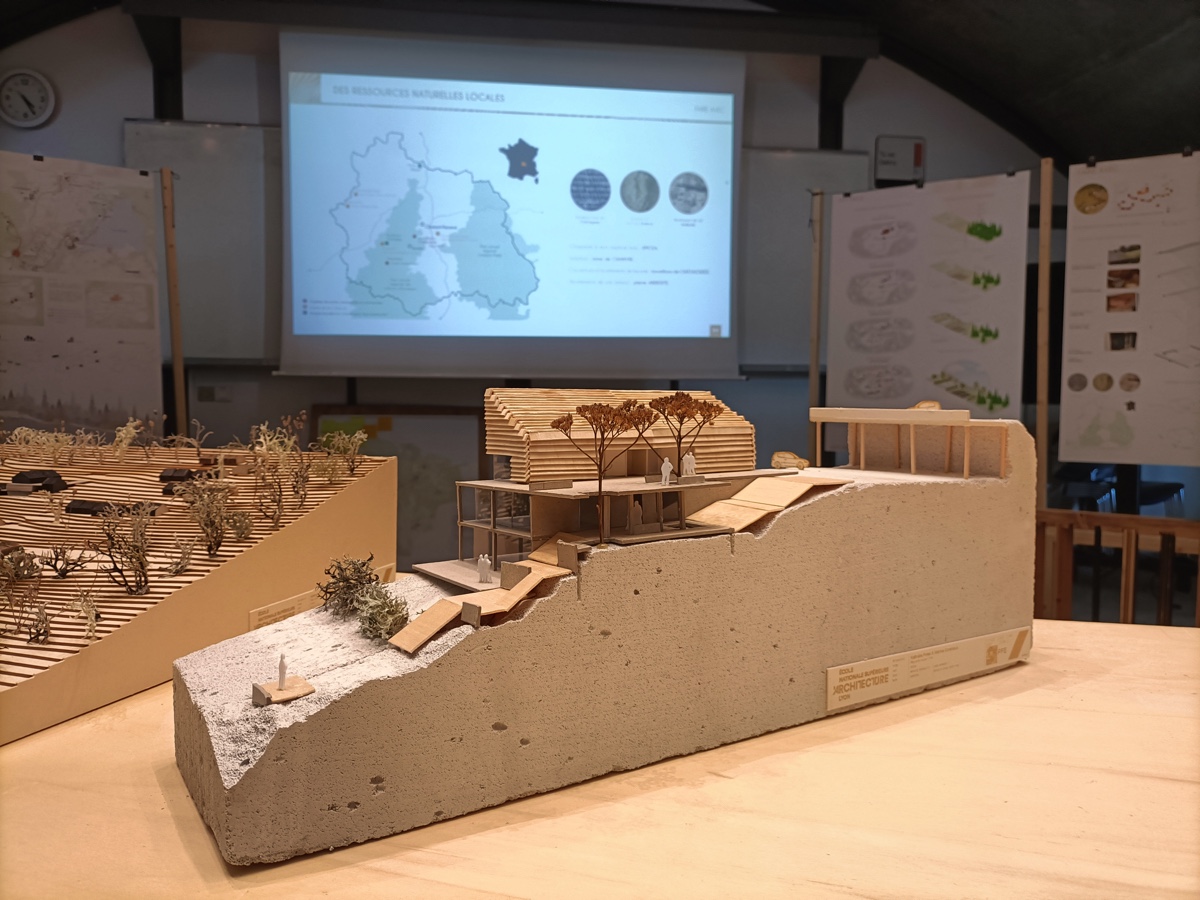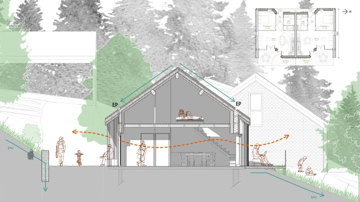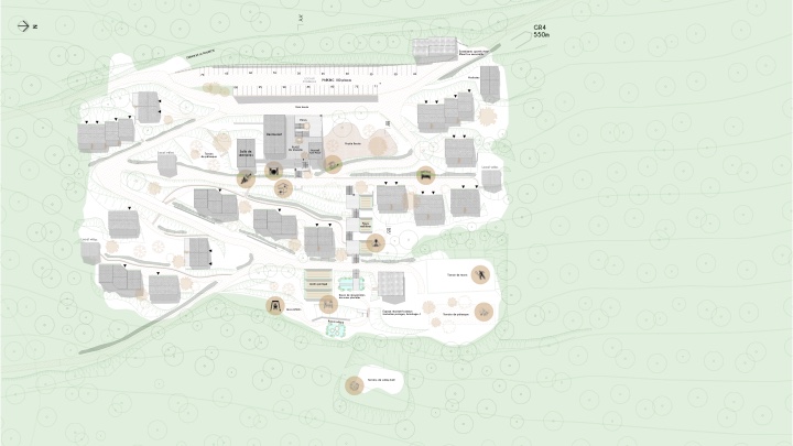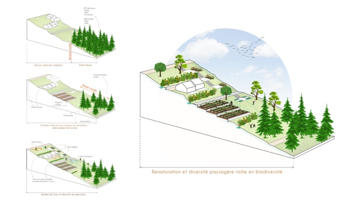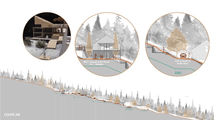 ![]() Marine Garénaux / Nathalie Potel-MassacrierDe la vacance à l’habitatRéanimation d’une friche touristiqueDe la vacance à l’habitat s’intéresse à l’ancien village vacances d’Aydat (63), anciennement propriété de la ville de Paris et abandonné depuis 2006. Le travail s’appuie sur l’opportunité de collaborer avec le nouvel acquéreur du site et sur la réalisation d’une analyse fine du territoire permettant de comprendre les enjeux de sa réanimation. Le projet propose, au moyen d’un scénario augmenté, des espaces réversibles et une mixité d’usages. Cela rejoint la volonté de faire évoluer l’occupation temporaire historique envisagée par le partenaire vers une occupation permanente. L’implantation de l’ancien village vacances, au cœur d’une forêt, sur le versant d’un volcan, a amené à travailler diverses thématiques comme les flux, le paysage, la ressource et le faire avec, afin de proposer un projet en adéquation avec les enjeux écologiques contemporains en intervenant au maximum dans les volumes existants et en repensant le sol et ses usages.