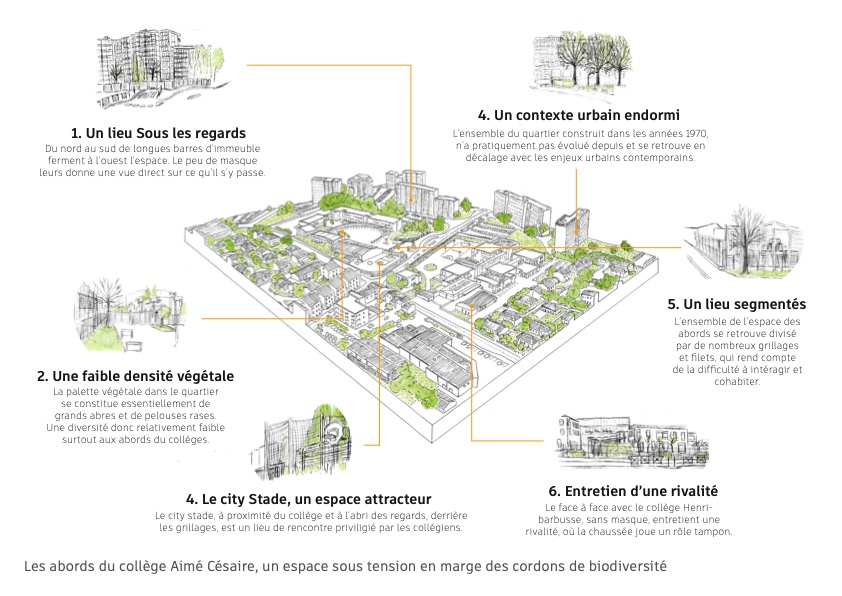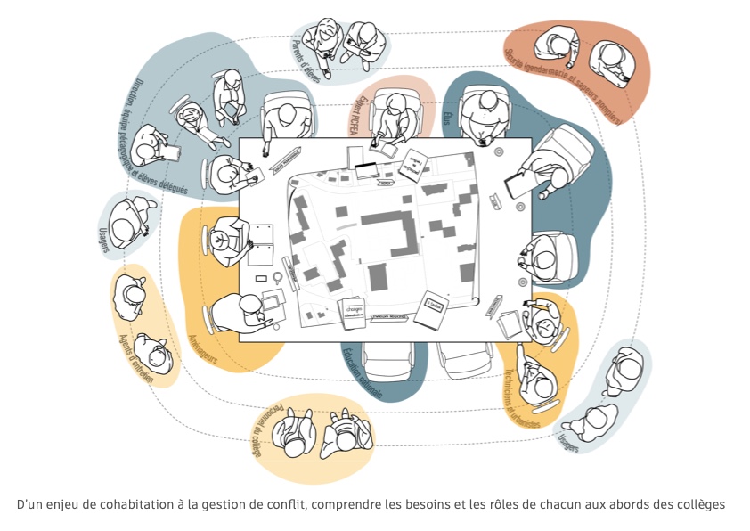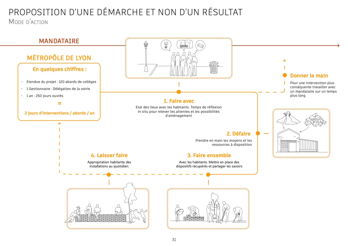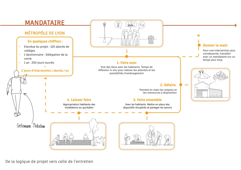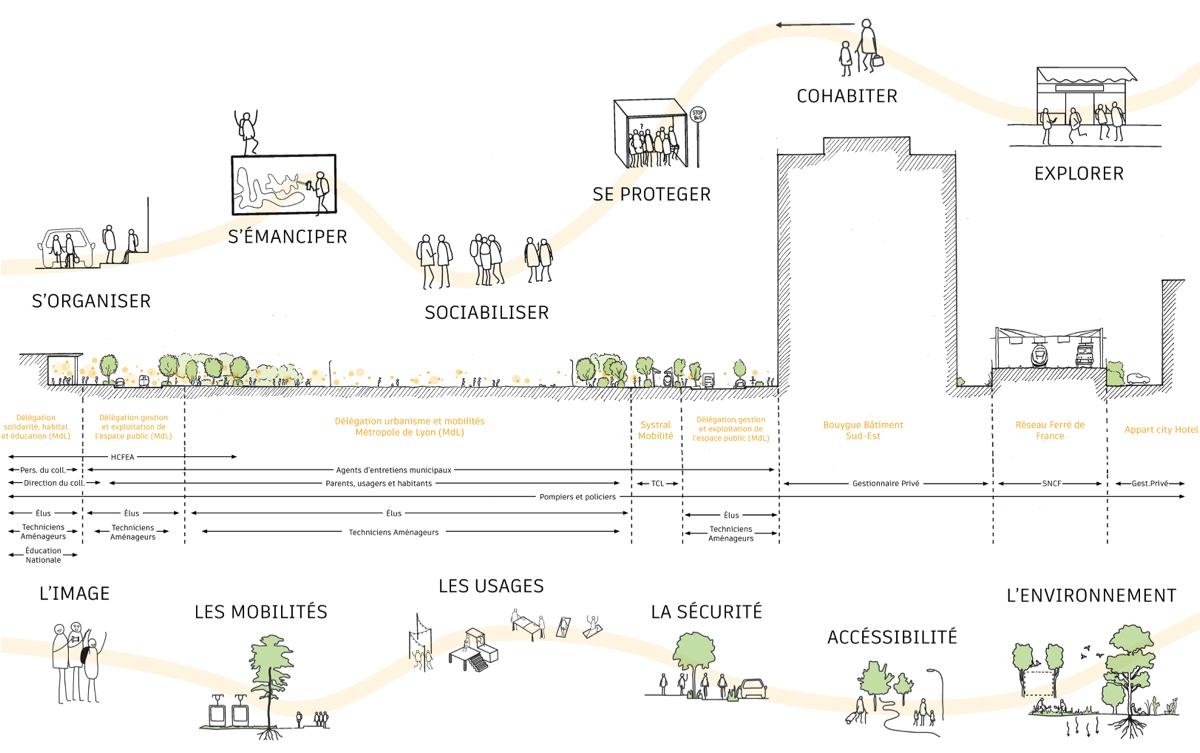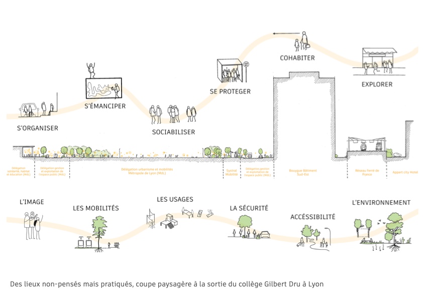 ![]() Noémie Hugnit / Mathieu SchmetsLes abords de collège : un espace de transitionLe ruban, relier des espaces fragmentés. Le concept de Stolon : s’enraciner et essaimerLes abords de collège de la métropole de Lyon sont des espaces complexes, gérés par une multiplicité d’acteurs. Au-delà de l’effervescence qu’ils incarnent, ils questionnent la place de l’adolescent en ville et la façon dont ils sont organisés. En collaborant avec les nombreux acteurs, l’objectif est de s’inscrire dans une réalité de terrain. Le projet repose sur l’idée d’habiter la limite, en utilisant l’usage comme moyen de faire du lien. Perméabiliser les usages, rendre visibles ces lieux de partage, proposer des espaces adaptés est une invitation à revoir profondément le rapport à l’aménagement des abords de collègeet à l’espace public. Le concept de Stolon permet de prolonger le regard jusqu’au sol, pour repartir du brin d’herbe à l’effritement de l’enrobé et d’un dispositif : le pavé, cette démarche bascule de la logique de projet vers celle de l’entretien. Ce processus, par un travail du sol, d’une altérité et du vivant, tente d’aller au dénouement de la réflexion pour s’ouvrir à une mise en pratique viable à l’échelle des 120 abords du territoire.