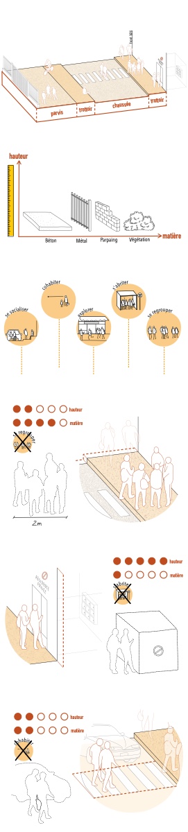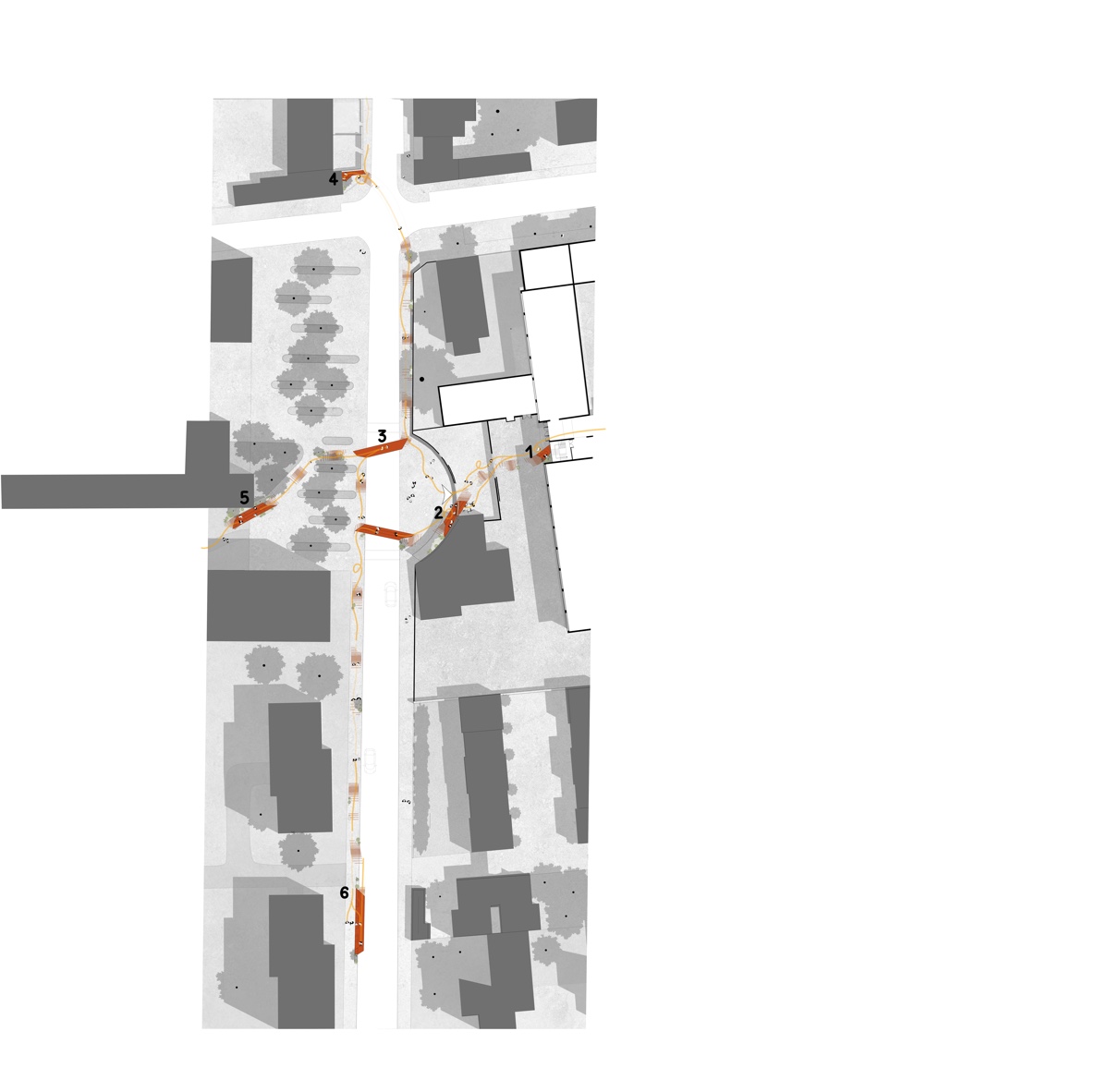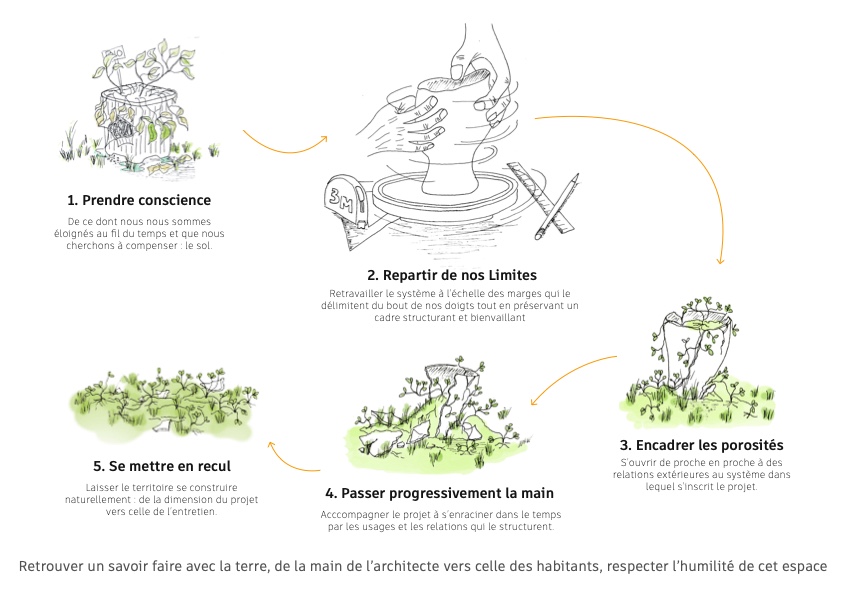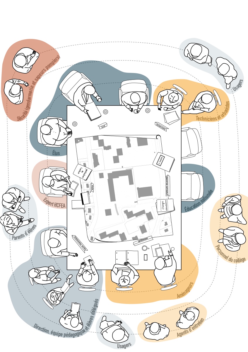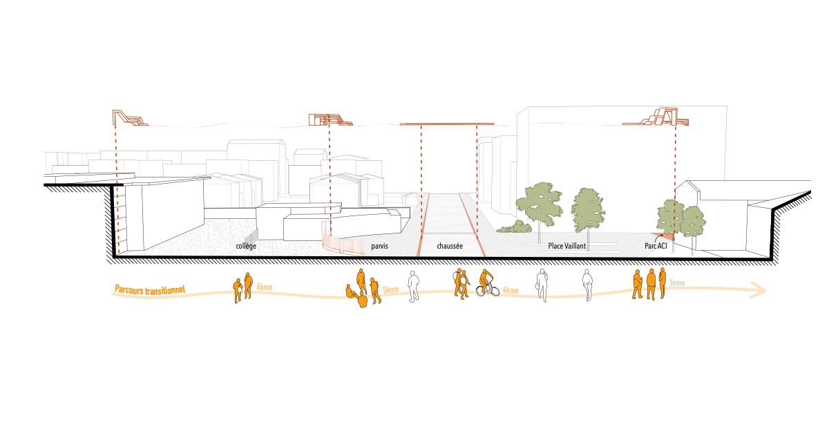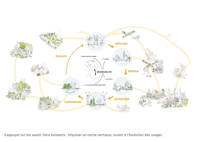 ![]() Noémie Hugnit / Mathieu SchmetsLes abords de collège : un espace de transitionLe ruban, relier des espaces fragmentés. Le concept de Stolon : s’enraciner et essaimerLes abords de collège de la métropole de Lyon sont des espaces complexes, gérés par une multiplicité d’acteurs. Au-delà de l’effervescence qu’ils incarnent, ils questionnent la place de l’adolescent en ville et la façon dont ils sont organisés. En collaborant avec les nombreux acteurs, l’objectif est de s’inscrire dans une réalité de terrain. Le projet repose sur l’idée d’habiter la limite, en utilisant l’usage comme moyen de faire du lien. Perméabiliser les usages, rendre visibles ces lieux de partage, proposer des espaces adaptés est une invitation à revoir profondément le rapport à l’aménagement des abords de collègeet à l’espace public. Le concept de Stolon permet de prolonger le regard jusqu’au sol, pour repartir du brin d’herbe à l’effritement de l’enrobé et d’un dispositif : le pavé, cette démarche bascule de la logique de projet vers celle de l’entretien. Ce processus, par un travail du sol, d’une altérité et du vivant, tente d’aller au dénouement de la réflexion pour s’ouvrir à une mise en pratique viable à l’échelle des 120 abords du territoire.