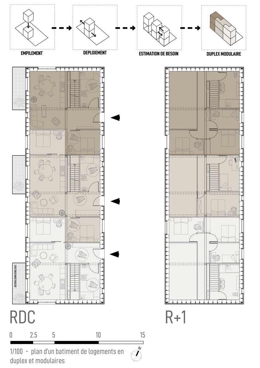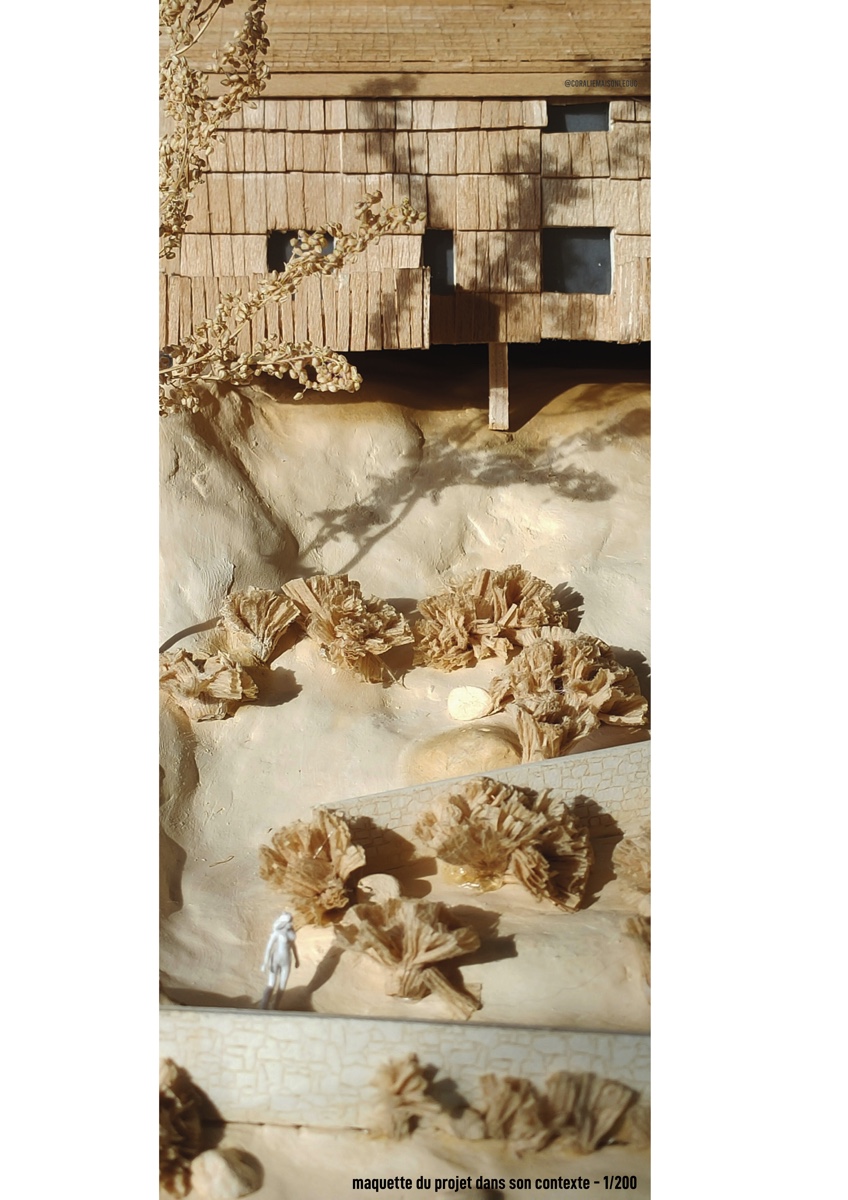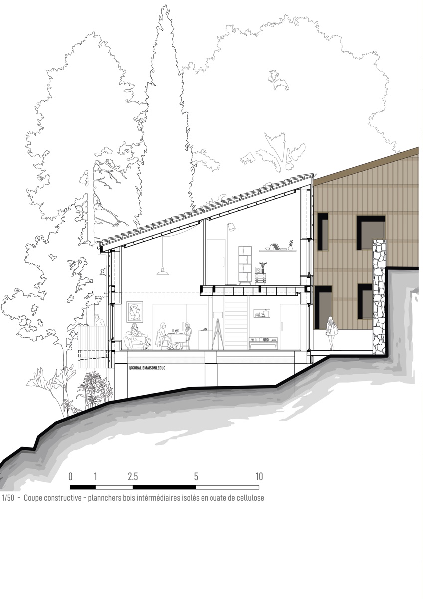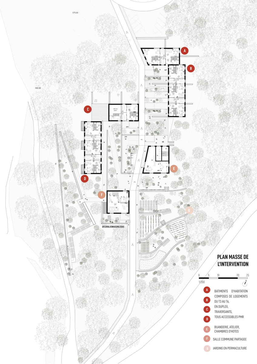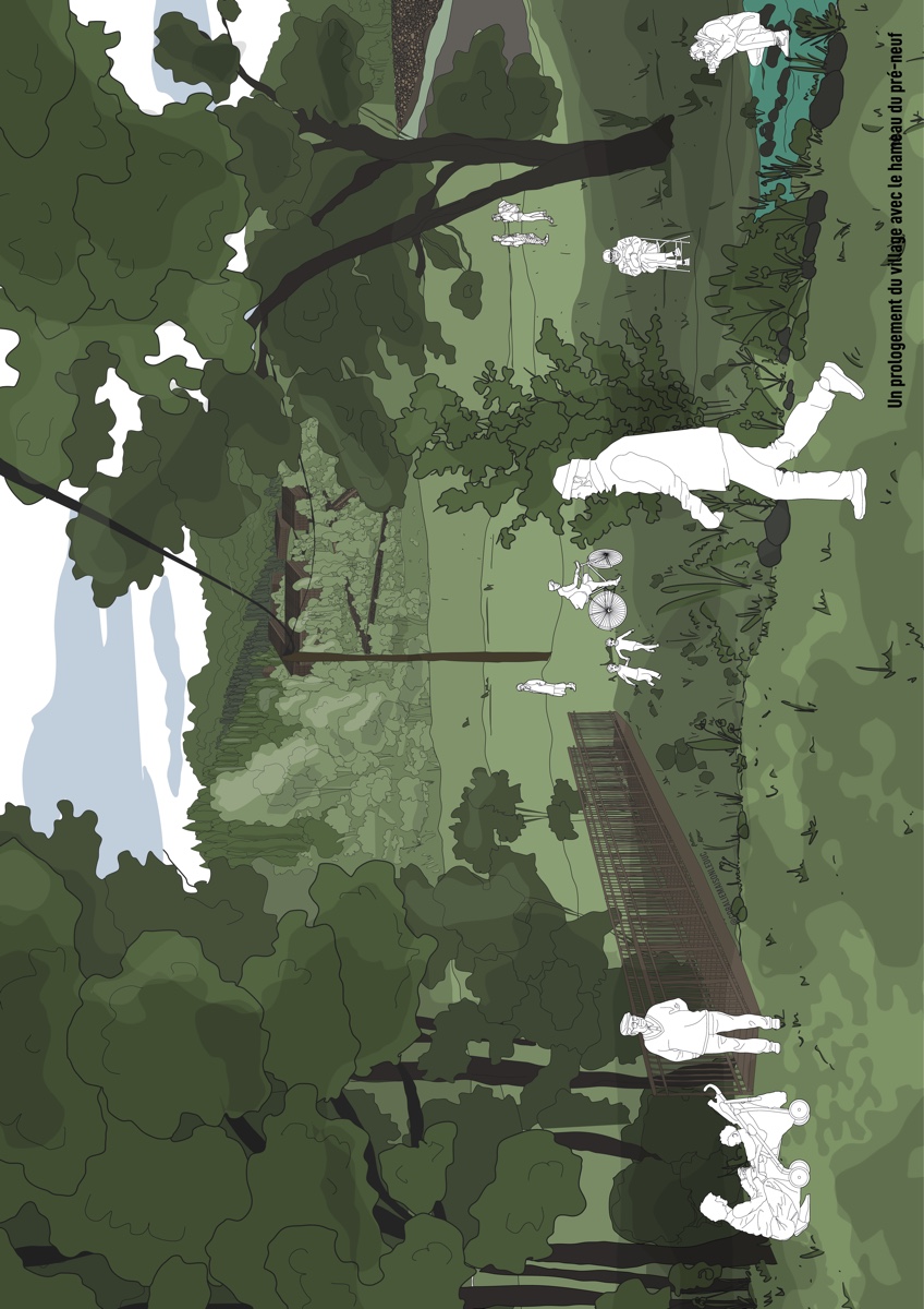 ![]() Coralie Maison LeducFaire projet à Saint-Barthélemy-GrozonLe hameau du Pré neufSaint-Barthélemy-Grozon est une commune d’Ardèche développée autour du Grozon. Le tracé de la route départementale a conditionné le développement du village. Le Grozon constitue une limite physique du centre-bourg, avec le pont de Gilhoc et la passerelle piétonne de la mairie facilitant sa traversée. Le site est aujourd’hui une porte d’entrée vers le patrimoine naturel du territoire. Autrefois agricole, le site est traversé par un cheminement menant à la forêt. Sa proximité directe avec la mairie, l’école et l’auberge du village en fait un atout. Face à une population vieillissante, le village doit augmenter son offre de logements accessibles. Le projet propose des espaces communs de partage, mutualisation et d’entraide intergénérationnelle tels qu’un atelier de bricolage, une salle commune, une buanderie et des chambres d’hôtes. S’intéresser à ce tiers paysage délaissé, c’est construire ensemble, avec frugalité, intégrant à la fois le respect de l’environnement et les dynamiques sociales locales, afin de garantir un développement harmonieux et durable du village.