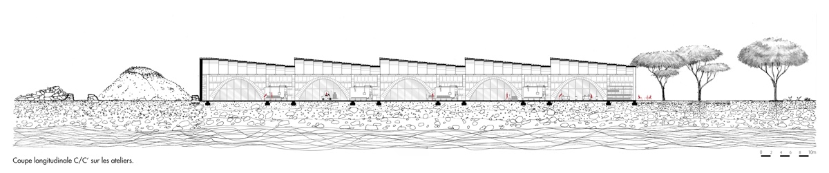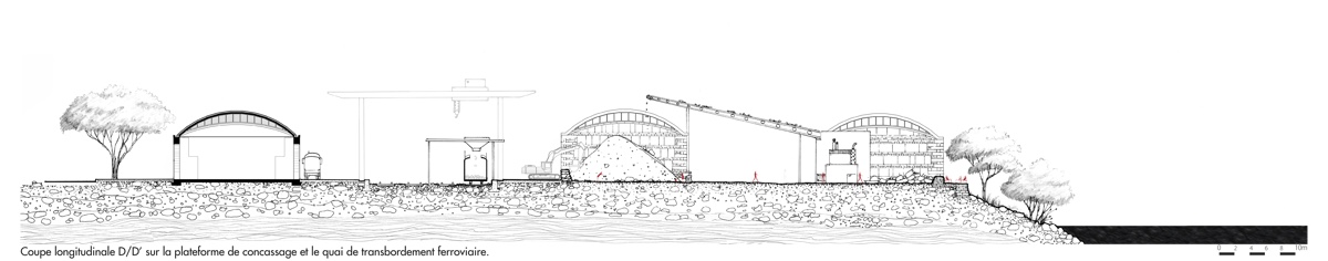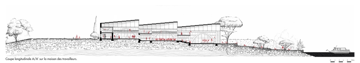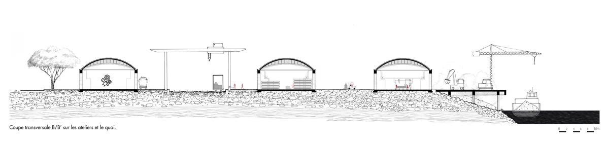 ![]() Louis ChamayouL’atelier des tailleurs de bétonDevenir post-carbone de la zone industrielle de la Courtine à AvignonLa zone industrielle de la Courtine fait partie de ces espaces périphériques de la métropolisation tardive déjà obsolète et pourtant toujours en activité. Sortie des champs par un plan de zoning moderniste, elle est le témoin d’un mode de production qui n’est plus soutenable face aux crises environnementales. Le ballet incessant des camions de transports de fruits et légumes partant d’Avignon doit laisser place à une économie soutenable pour une ère post-carbone. L’atelier des tailleurs de béton s’attache à redéfinir l’avenir post-carbone de cet espace industriel, entre déconstruction et refertilisation des sols, de nouvelles activités centrées autour du réemploi de matériaux de construction prennent place au bord du Rhône afin de remettre le fleuve au centre des paysages productifs. Le projet se veut également un test de recircularisation du cycle de vie du béton armé en proposant une nouvelle technique de réutilisation du béton armé. Les structures existantes sont découpées en blocs qui seront maçonnés pour former les nouveaux ateliers de production.