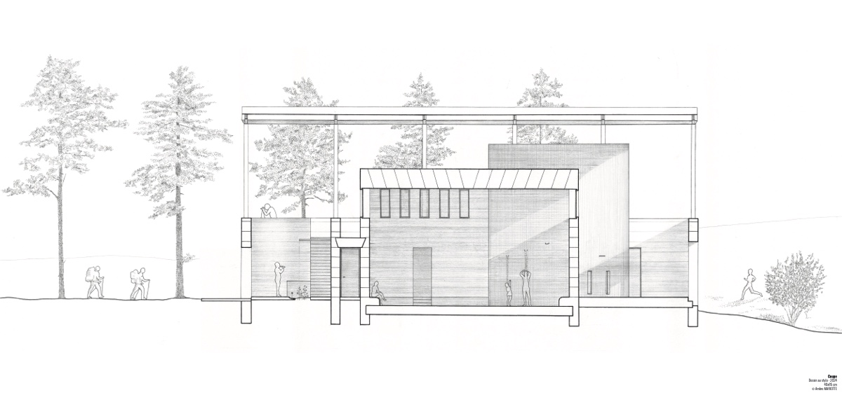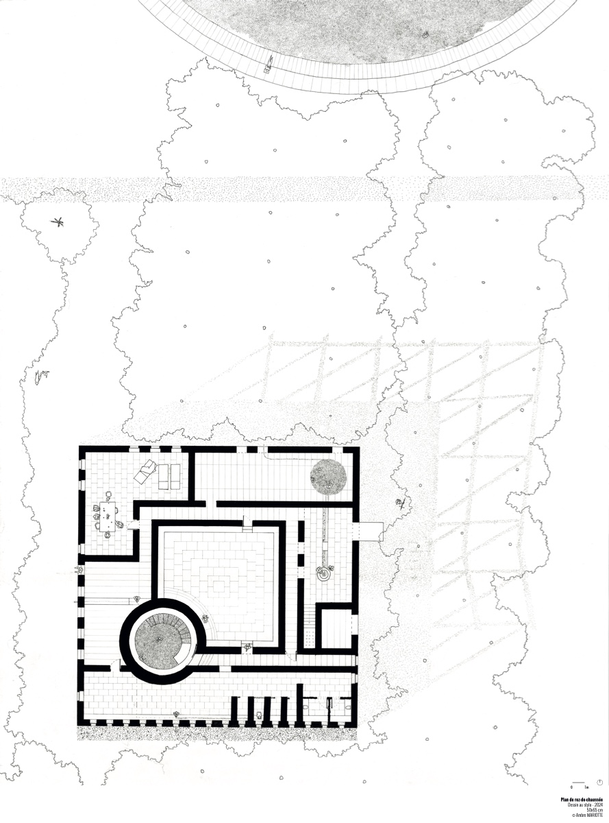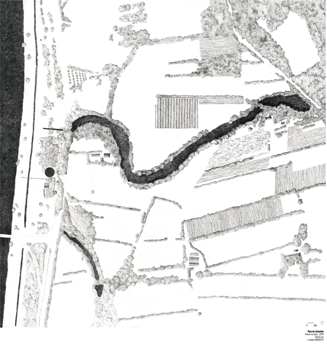 ![]() Ambre MariotteLa bégudeOu le cercle des eaux disparuesLe lieu : Au sein de la plus grande île fluviale européenne, de nombreux mécanismes techniques sont entremêlés à la géographie physique. Malgré son caractère insulaire, le territoire de l’île de la Motte, au nord de l’île de la Barthelasse, est marqué par la production et l’exploitation. Ces paysages de l’eau, bordés par le fleuve et son canal, ancrés sur la nappe phréatique, irrigués de toutes parts, et traversés par la Via Rhôna, laissent peu de place pour approcher l’eau. Le programme : Une bégude était historiquement une halte où les voyageurs s’arrêtaient pour boire avant d’entreprendre un long chemin. L’interprétation de ce programme disparu permet de révéler les pratiques d’itinérances en proposant un lieu de repos, où l’eau est appréciée à sa juste valeur. Le processus : Intégrée au cycle de l’eau, La bégude propose un moment hors du temps, dans lequel les objets hydriques sont repensés afin d’éloigner les moyens d’accaparement de l’eau pour permettre des relations conviviales.