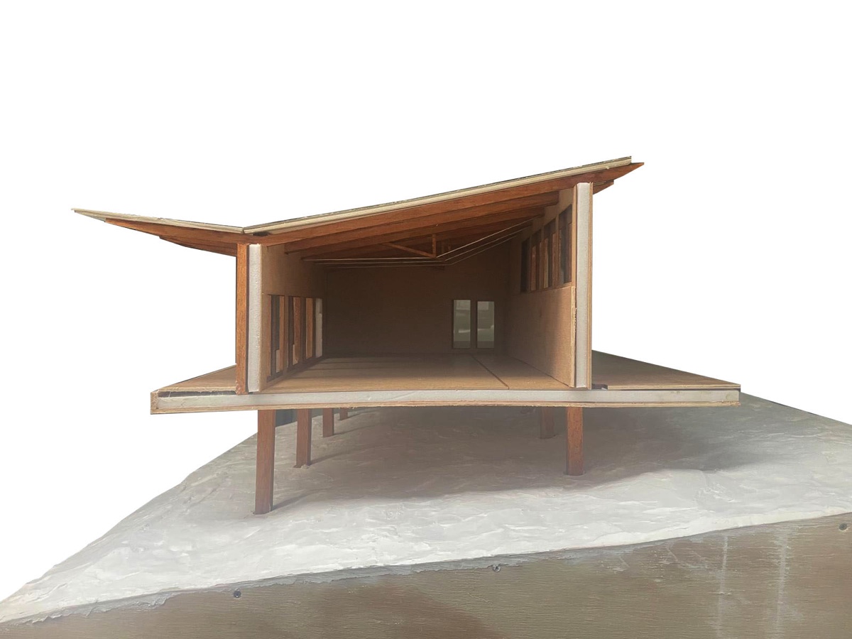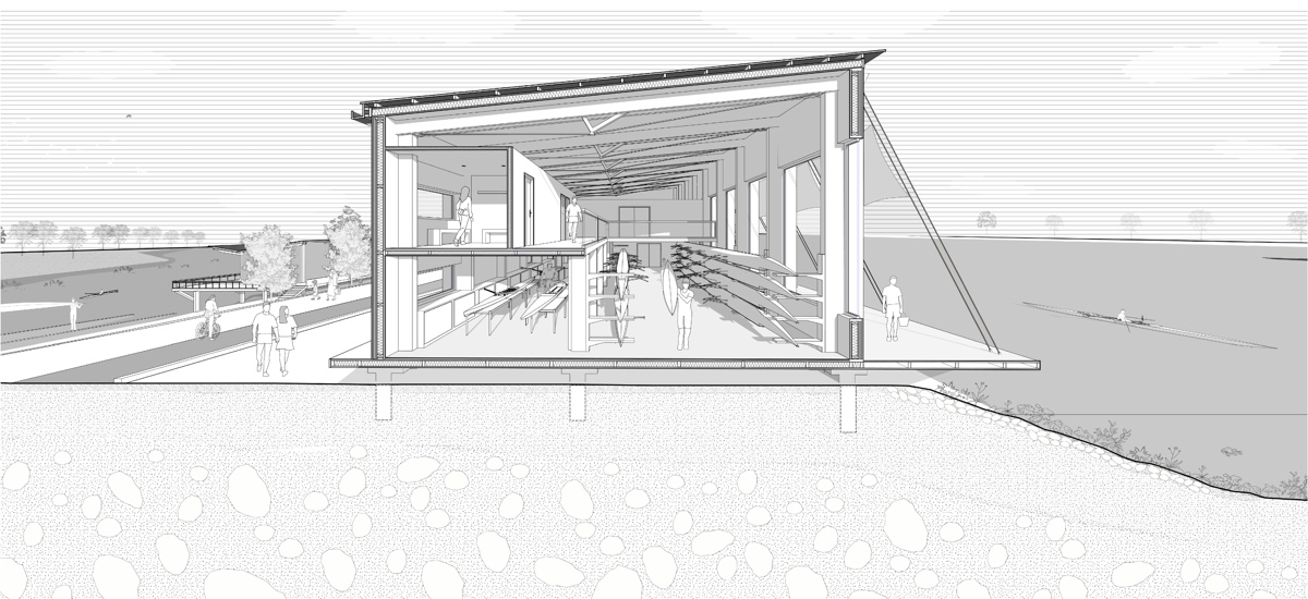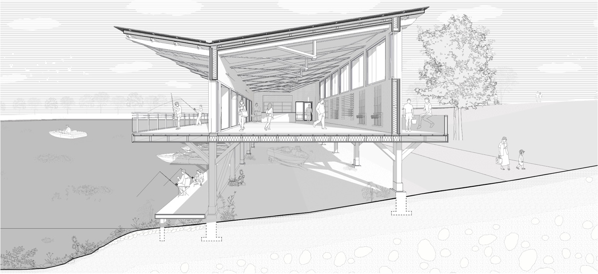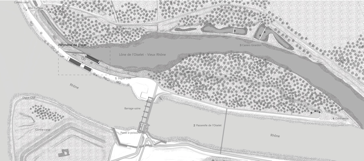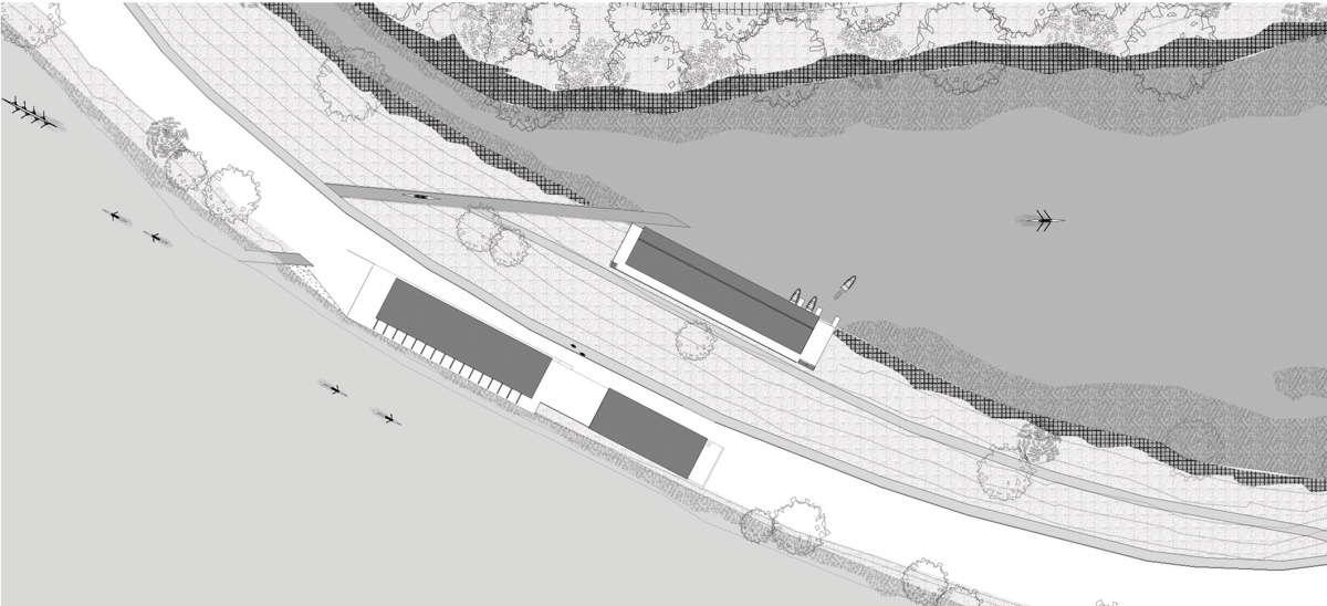 ![]() Ayman El BiyadiRéveil de la culture fluviale sur le Rhône aménagéUne base nautique pour la pêche sportive et l’aviron sur la lône de l’OiseletL’aménagement de nouveaux canaux d’amenée pour les barrages a nécessité la rupture de plusieurs bras du Rhône, les lônes. Le projet se situe sur celle de l’Oiselet, un ancien bras du fleuve endigué pour la construction du bras du barrage de Sauveterre. Cette lône est un espace paysager séparé du bras actif du Rhône par une digue de la Compagnie Nationale du Rhône. Cette digue marque une rupture entre deux temps du fleuve : celui du fleuve mécanique et celui du fleuve naturel. L’enjeu est de synchroniser ces deux temps du fleuve, en recréant sur les rives de cette digue, des espaces d’usages propres aux pratiques fluviales. Le programme prévoir la création d’une base nautique pour la pêche sportive et l’aviron, fonctionnant chacune sur sa rive, avec la création d’espaces intermédiaires communs aux usagers. L’implantation sur la digue permet d’appréhender sa réalité infrastructurelle. Les architectures qui émergent sur ce site cherchent à recréer un sol qui lévite sur la digue. Les systèmes constructifs participent à la recherche d’une implantation légère et respectueuse des lieux.