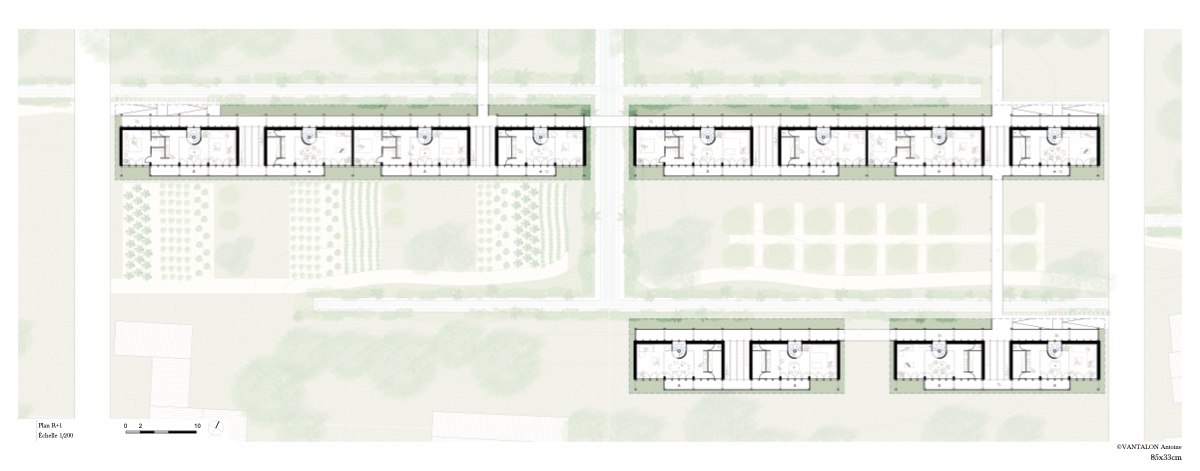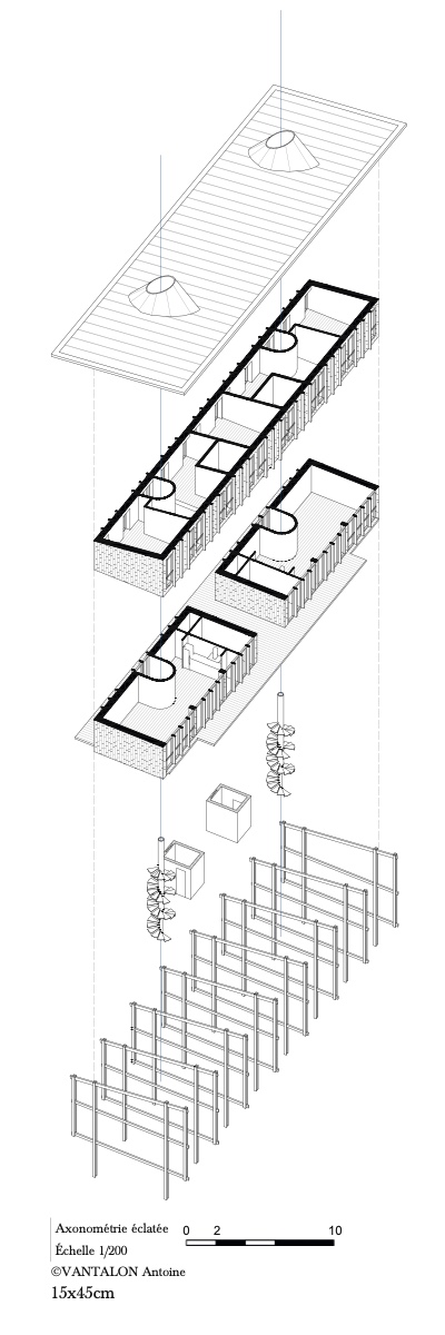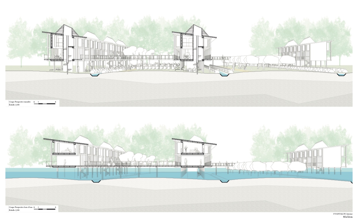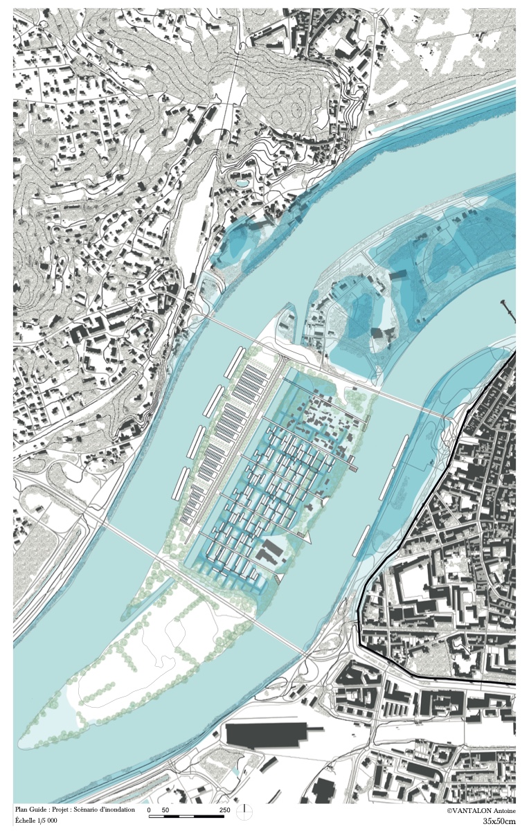 ![]() Antoine VantalonL’Île Piot, un quartier fluvialConception d’un projet dans un milieu inondableL’Île Piot, un quartier fluvial prend place au sud de l’Île de la Barthelasse, sur la pointe entre Avignon et Villeneuve-lès-Avignon. Le site se trouve entre deux bras du fleuve Rhône, rendant la zone inondable comme une large portion du territoire alentour. L’objectif est de proposer un aménagement urbain à l’échelle urbaine capable de s’adapter aux différentes crues su Rhône. Le projet tend à créer deux strates : le niveau du sol naturel qui est à majorité public et qui peut être arpenter par le plus grand nombre, et des espaces privés alloués aux habitants se trouve aussi à proximité des logements. Ces espaces privés sont partagés entre les riverains. Le deuxième niveau est composé de passerelles reliant chaque bâtiment, à une hauteur déterminée pour qu’en cas de crue, les habitants ne se retrouvent pas isoler dans leurs habitations. Ce dispositif permet aux habitants de s’adapter à l’eau et de retrouver ce contact visuel et physique avec les fluctuations du Rhône, perdu depuis les travaux de la Compagnie Nationale du Rhône en 1973.