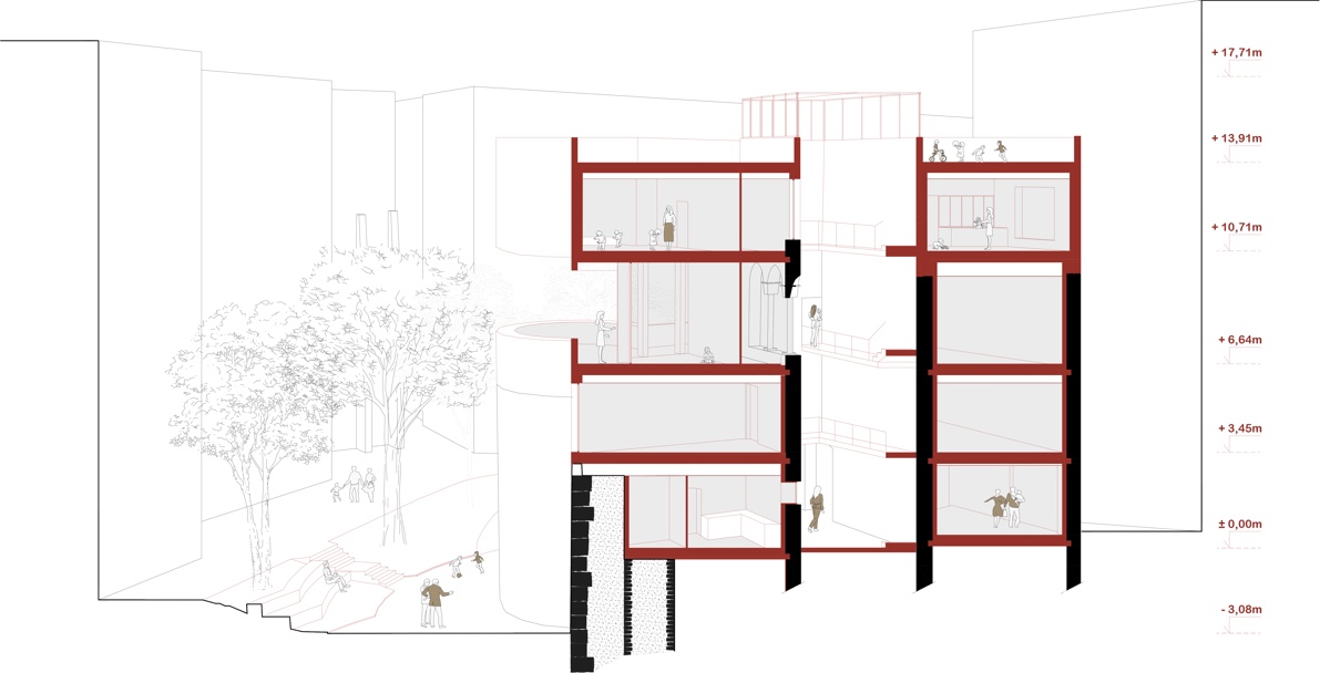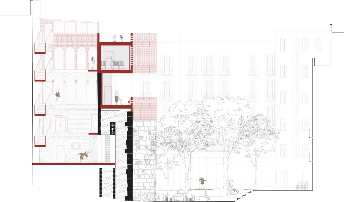 ![]() Lise ChevalierGardienne de l’histoire et protectrice des enfantsIntervenir sur la muraille romaine de Barcelone, plaça dels Traginers de son immobilismeLa plaça dels Traginers, emblématique pour ses vestiges romains, très bien conservés, a été créée dans le but de révéler la muraille et sa tour d’angle arrondie dans les années 1970. Elle offre aujourd’hui un potentiel de requalification de ces espaces publics dans le cadre d’un projet à l’échelle urbaine qui permet de re-questionner les abords des remparts. En parallèle, la valorisation de la muraille romaine est l’occasion de proposer un aménagement répondant aux enjeux contemporains du quartier gothique. La muraille romaine crée également une limite évidente, autant du point de vue historique, spatial que social. À l’intérieur de celle-ci, à l’abri des regards, le mur aura pour projet de protéger vingt-cinq enfants de deux mois à trois ans, dans un lieu créé pour les petits Barcelonais. La muraille devient alors le monument central qui délimite un espace public dans le cadre d’un parcours culturel, mais également d’aménagements ouverts à tous, à un cocon agréable pour les enfants.