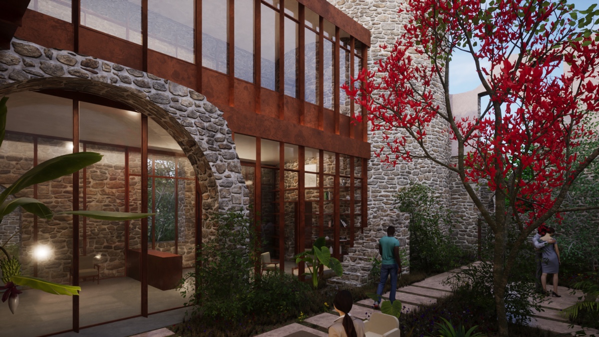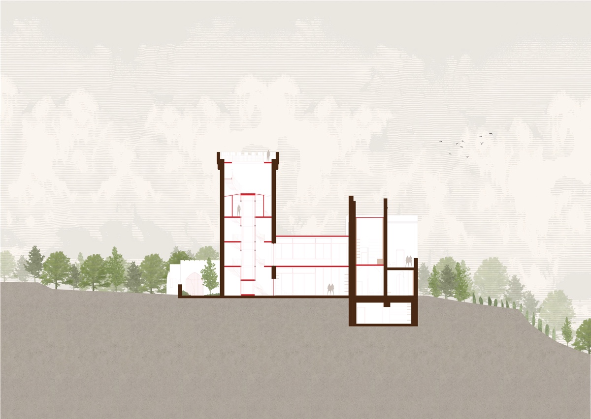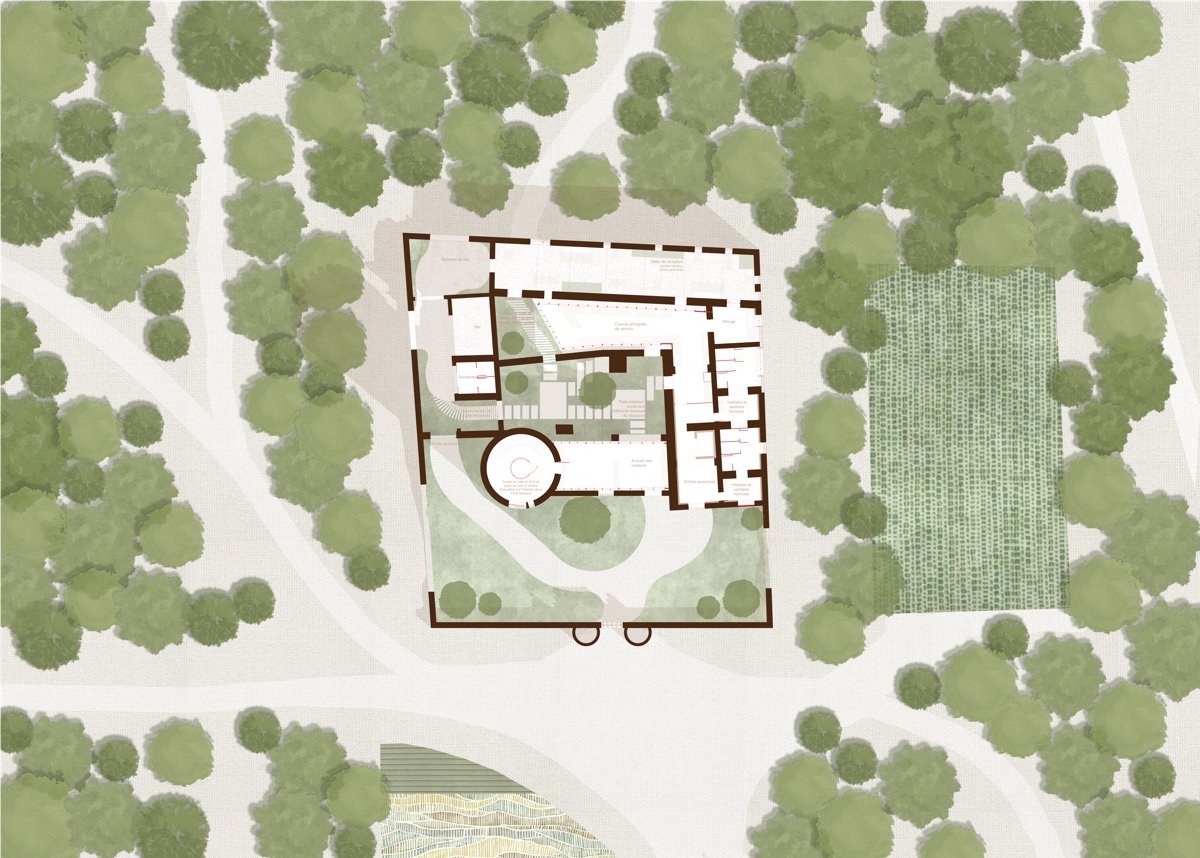 ![]() Bertille PersonnazRéveiller la ruineUn institut culinaire dans les ruines de la Torre SalvanaRéveiller la ruine consiste en la création d’un institut culinaire au sein des ruines d’un ancien château et ferme fortifiée : la Torre Salvana, située à la périphérie de Barcelone. Destiné aux chefs étoilés pour des séminaires, des rencontres professionnelles et des formations, ce programme répond également à un besoin de dynamisation touristique et locale. L’intervention vise à mettre en valeur la ruine dans son état de délabrement actuel. Les nouveaux volumes ne sont visibles qu’une fois à l’intérieur dans les ruines. De plus, selon l’état des murs, la stratégie d’intervention varie : utilisation de la structure existante comme support aux ajouts, création d’une extension à l’intérieur des ruines et conservation de l’espace extérieur actuel. L’objectif est de révéler les ruines, en plaçant les cuisines au centre du projet. La mise en place de parcours dans la parcelle et de la ruine permet un séquençage des différentes étapes, de la production à l’assiette, tant pour les professionnels que pour les visiteurs.