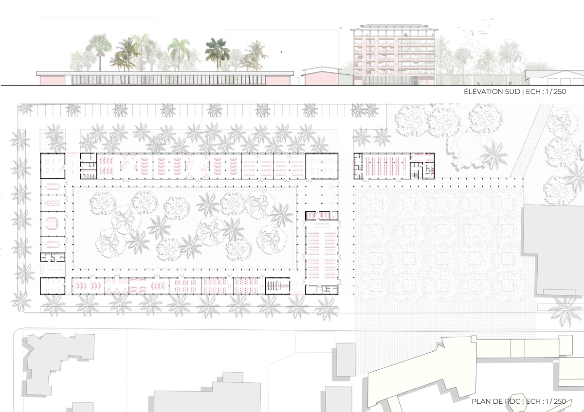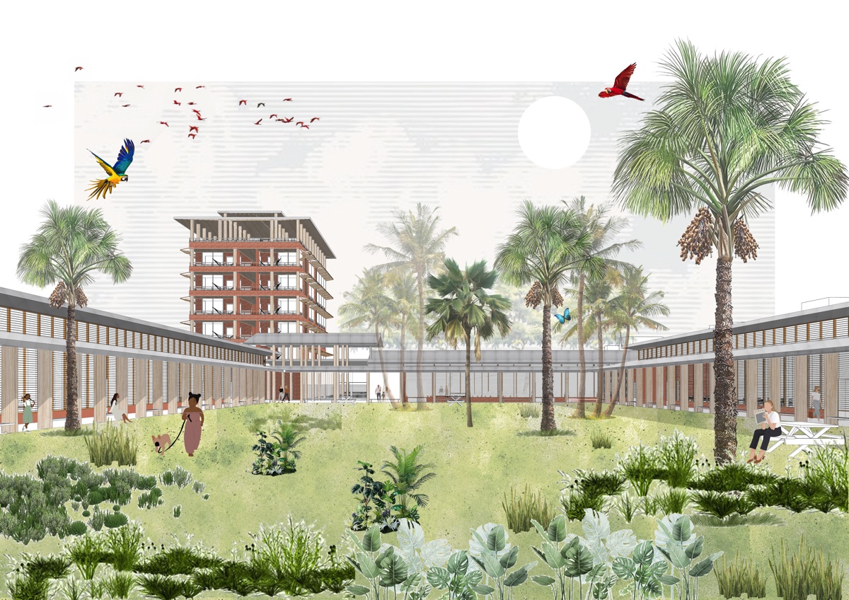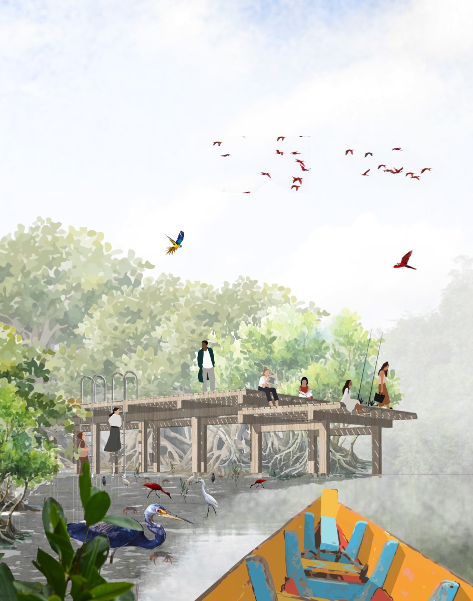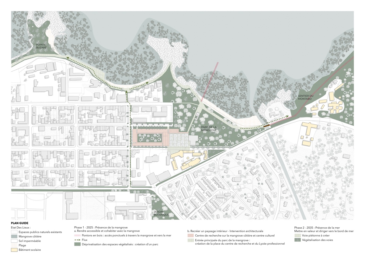 ![]() Sarah ChanCayenne, Guyane françaiseQuand la ville étreint la mangroveCayenne, Guyane française se situe dans le quartier de l’Anse Châton, en Guyane Française. À proximité, le centre-ville est basé sur un plan orthogonal du 18e siècle. L’objectif est de réaménager les marges du centre-ville, en prenant en compte les besoins spécifiques du territoire (équipements et espaces publics). En outre, le site dispose d’un environnement naturel remarquable : la mer, la mangrove côtière, une forêt de palétuviers abritant animaux et insectes, paysages qui alternent environ tous les quinze ans. Le programme prévoit : un centre de recherche sur la mangrove côtière, un centre culturel, des logements pour chercheurs, un belvédère et un ponton en bois, la création d’un parc gérant la lisière entre l’espace bâti et la mangrove. Le projet propose des alternatives, en composant avec la mangrove côtière, avec la disparition du littoral, ainsi que les variations d’ambiances générées, afin de sensibiliser les personnes à la protection de cet écosystème riche en biodiversité.