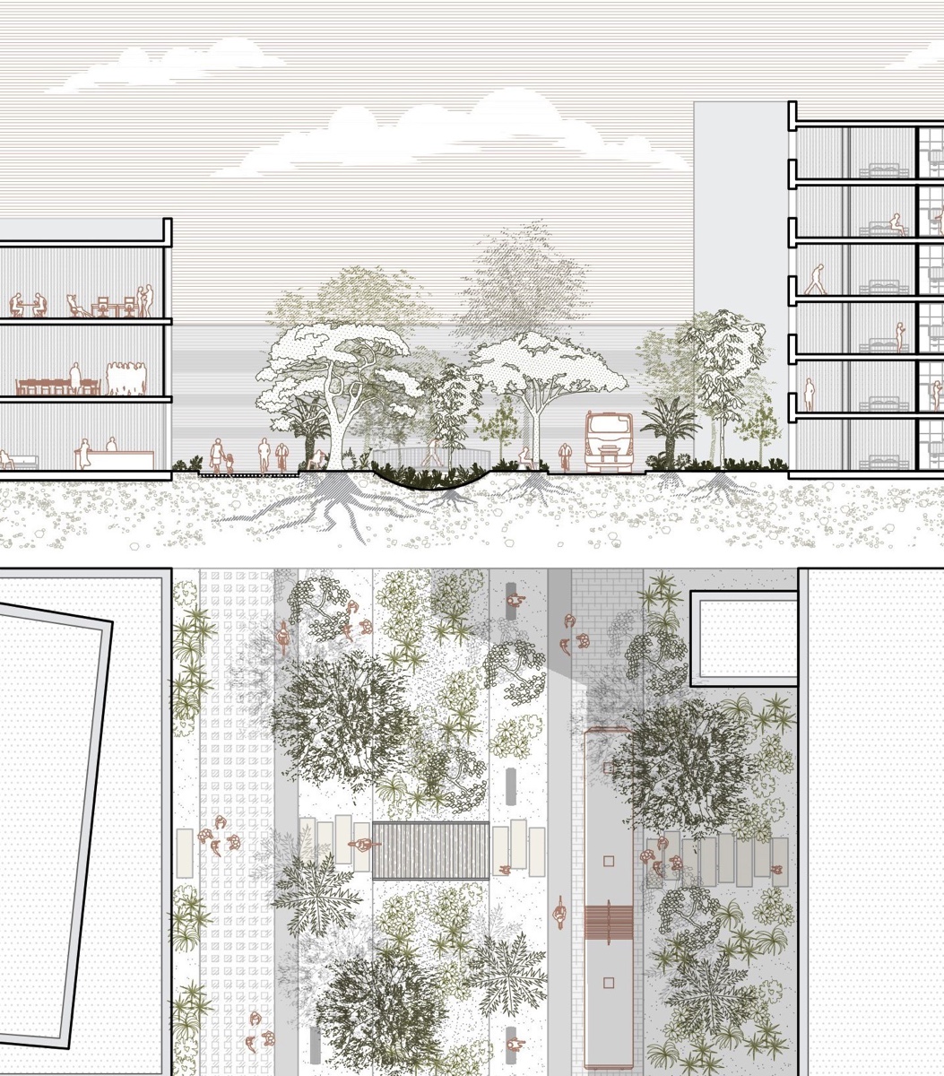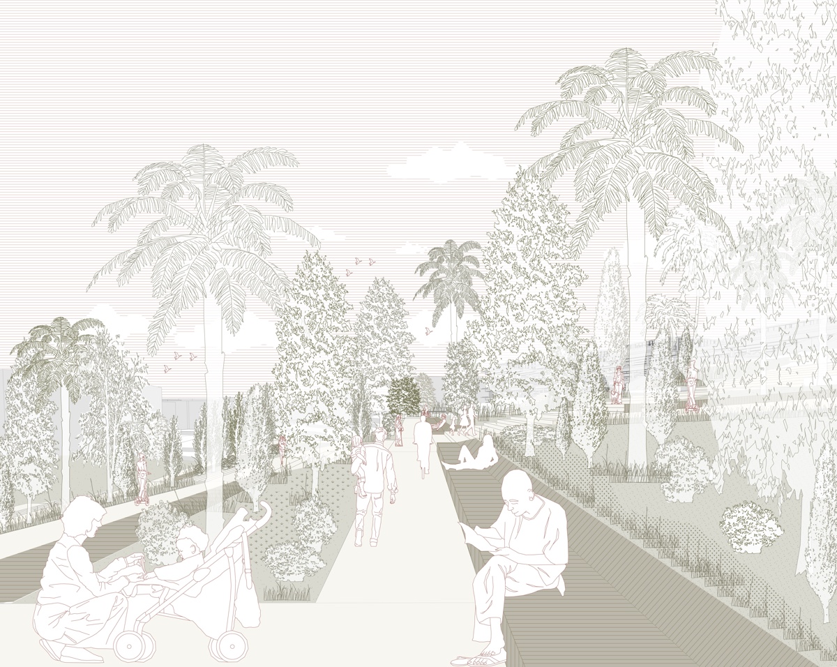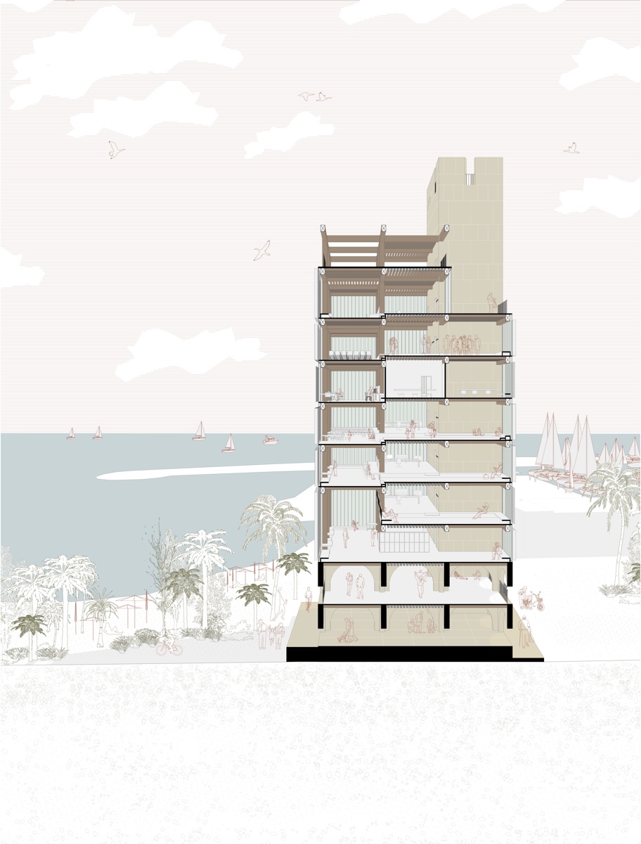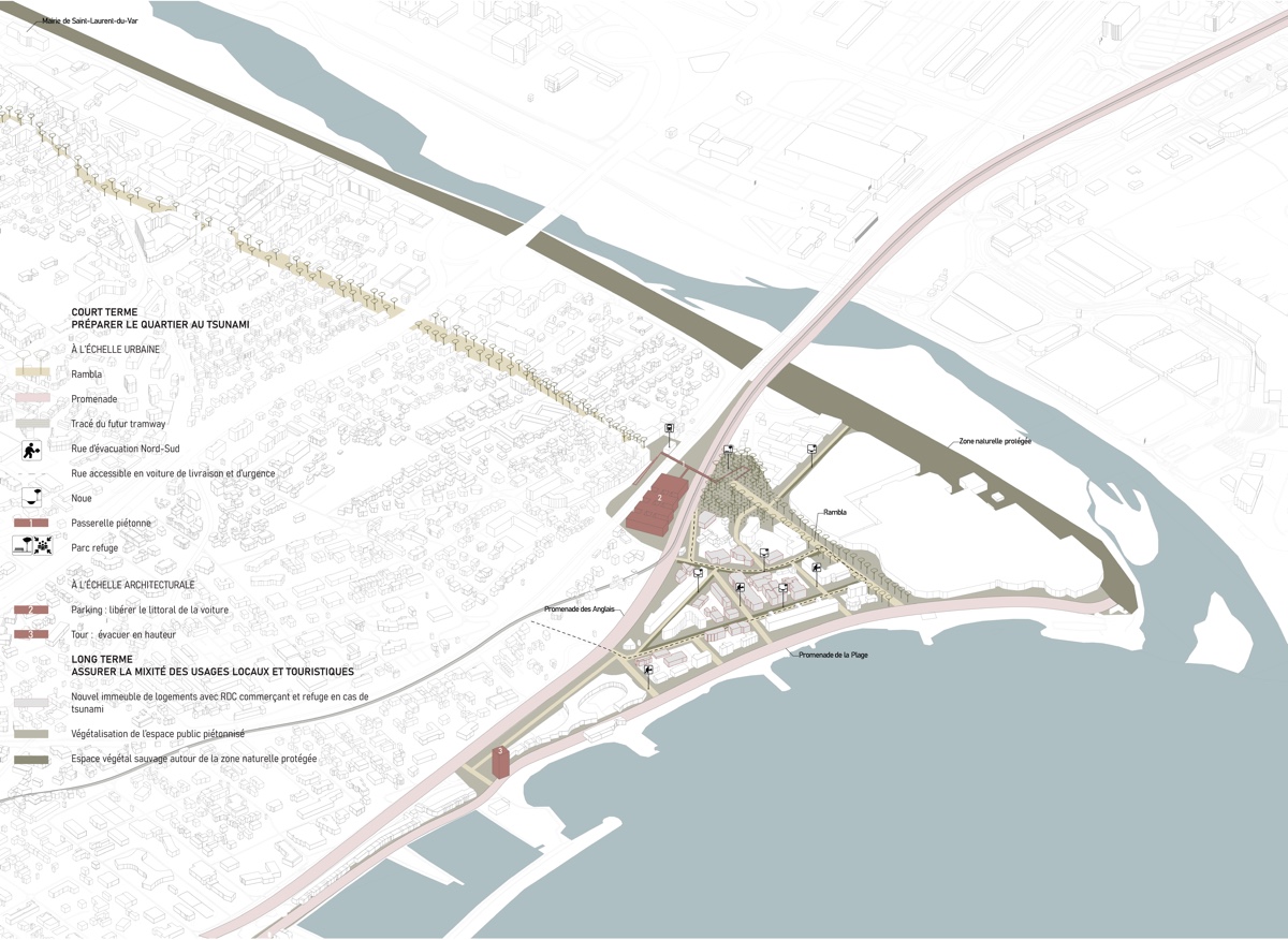 ![]() Maghali AchiArife AkyolLes Vespins, Saint-Laurent- du-VarRequalifier la façade littorale au regard du risque de tsunamiL’UNESCO alerte avec une probabilité de 100 % à l’horizon 2030, de la survenue d’un tsunami sur le littoral méditerranéen. Aucune réglementation urbaine ou norme de construction, n’est encore associée à ce risque, si ce n’est le fait qu’il est interdit d’évacuer à bord d’un véhicule car cela constitue un élément aggravant. Le quartier des Vespins, la façade littorale de la ville de Saint- Laurent-du-Var, fait partie de ces villes du littoral où aucune mesure de protection n’a encore été prise. Le projet propose de requalifier la façade littorale de Saint-Laurent-du-Var au regard du risque de tsunami par sa piétonnisation, en vue d’en faciliter l’évacuation. Ce nouveau quartier propice à la déambulation, libéré de ses véhicules, laisse place à la végétation. Il devient un grand jardin, rappelant les jardins suspendus de Babylone. Sont associés à ce projet urbain deux architectures-infrastructures réenchantées par cet imaginaire méditerranéen : un parking silo et une tour refuge, indispensables à la piétonnisation et à la résilience du quartier aux tsunamis.