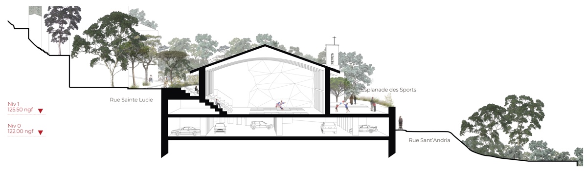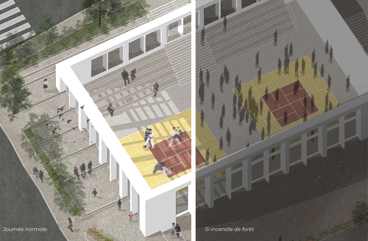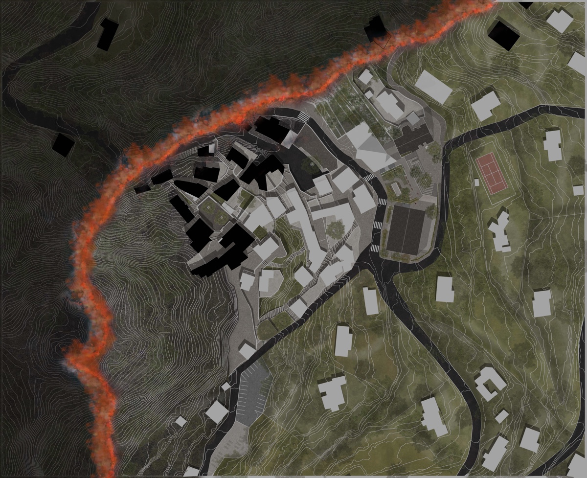 ![]() Yaëlle Bouvard-VignaudA rinascita di BigugliaRéinsuffler de la vie au cœur d’un village corseEn 2017, un incendie de forêt ravage Biguglia, en Corse. Si pour la majeure partie des interfaces zone habitée/zone à risque les enjeux concernent des biens humains et matériels, il demeure une lisière urbaine : le cœur de village de Biguglia. A rinascita di Biguglia propose un aménagement contrôlé et une stratégie de mise en sûreté des édifices et de la population. Néanmoins, si le risque est permanent, le feu, lui, ne l’est pas. Il était alors indispensable de réaliser un diagnostic du village en élargissant les paramètres et la zone d’analyse afin de superposer les enjeux de “l’impérieuse nécessité d’agir” en tout temps. Les premières analyses, dictées par des sensations et des ressentis personnels sur le terrain ont guidé vers le sujet des espaces publics. L’objectif est de redonner au village son rôle de centralité, à ce jour délaissé au profit d’une plaine de la Marana dynamisée par les lotissements, les zones commerciales et industrielles.